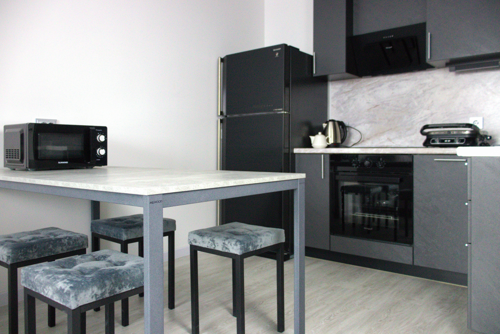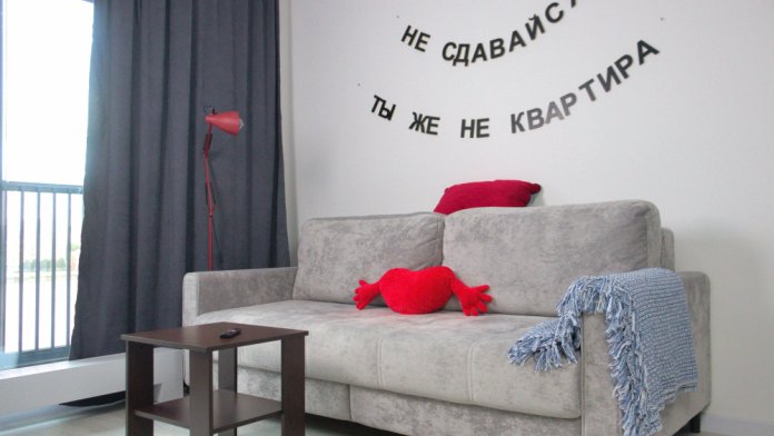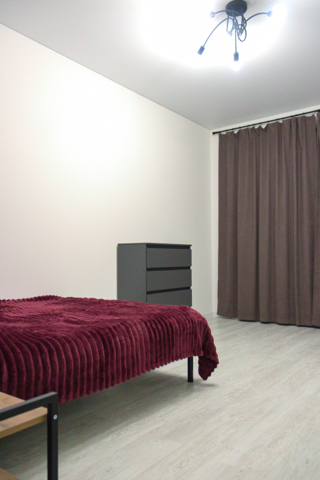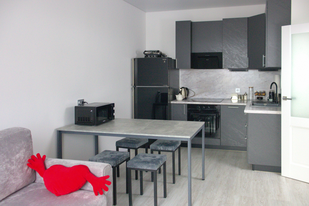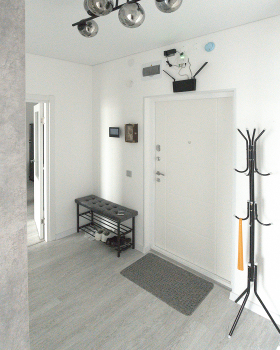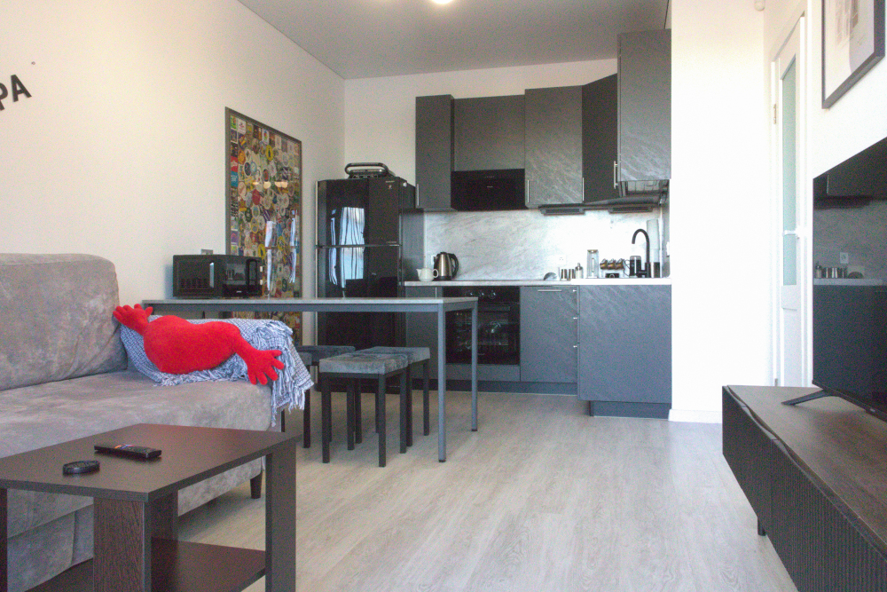 Интерьер выполнен в спокойных светлых тонах с акцентами в стиле минимализм, что создаёт атмосферу уюта и комфорта. В апартаментах могут разместиться до 6 гостей.