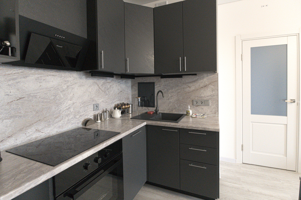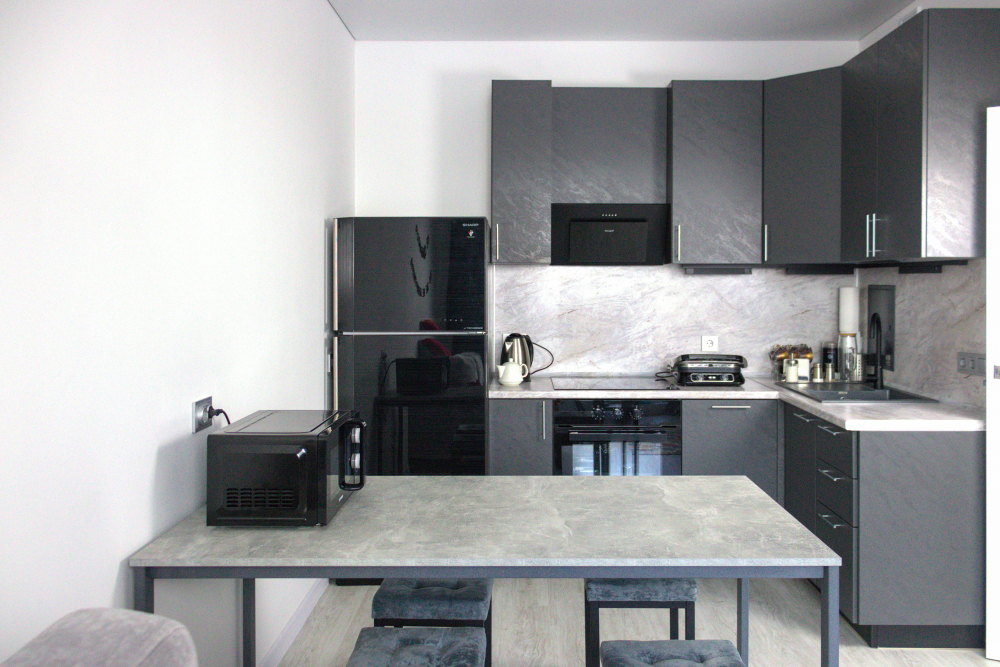Кухня полностью оборудована: варочная панель, духовой шкаф, холодильник, микроволновая печь, чайник, посудомоечная машина и кухонные принадлежности.