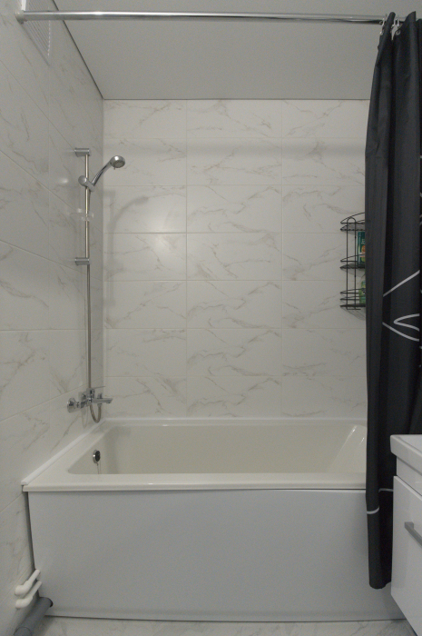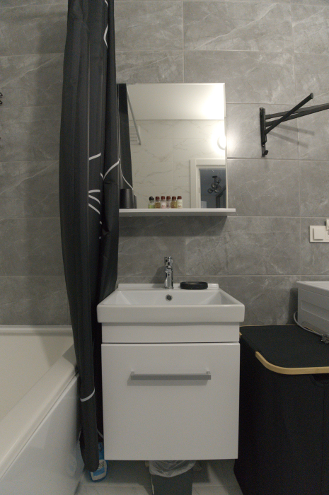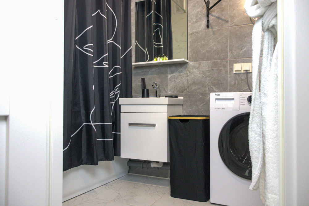 Современный санузел с ванной укомплектован стиральной машиной, полотенцами и фирменными косметическими наборами.