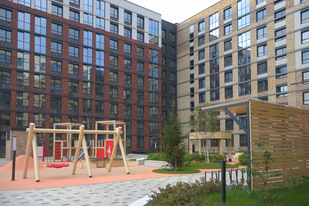 Закрытая территория жилого комплекса оснащена детской площадкой, прогулочными зонами и круглосуточной охраной.