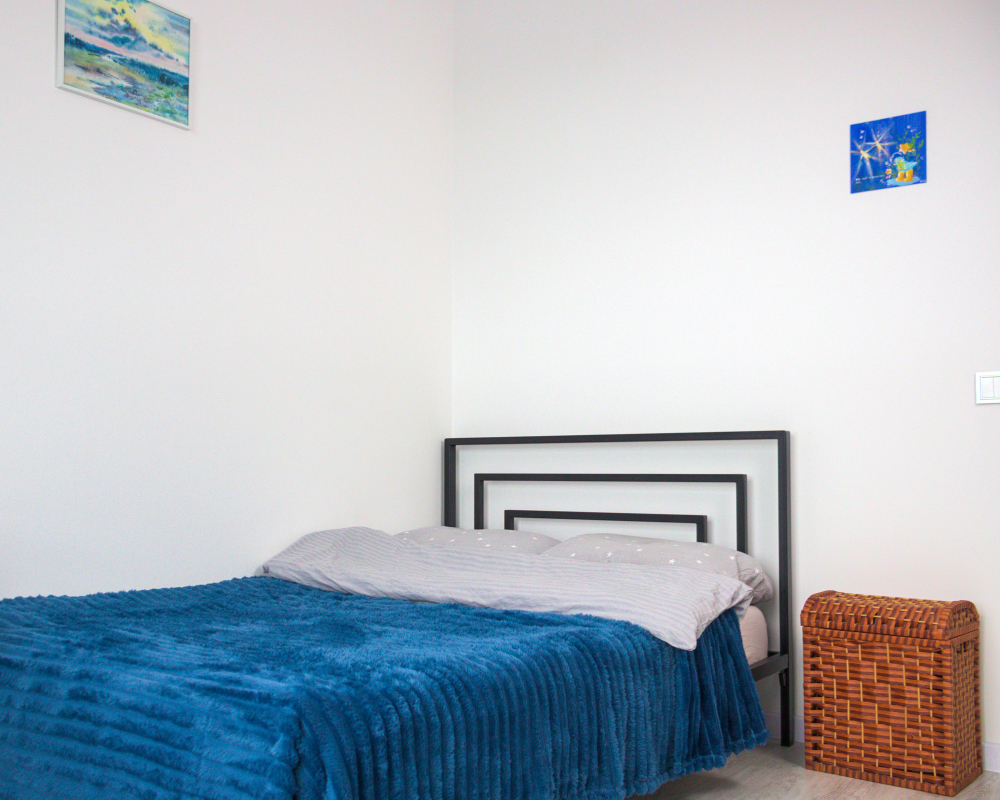 Для отдыха предусмотрены две отдельных спален с двуспальной кроватью и рабочим местом у окна с видом на набережную.