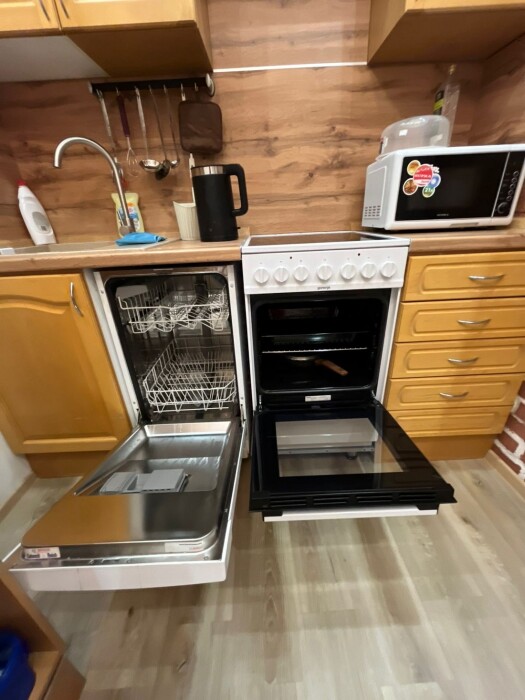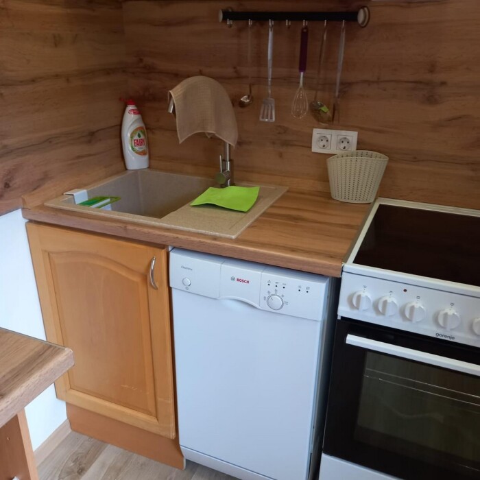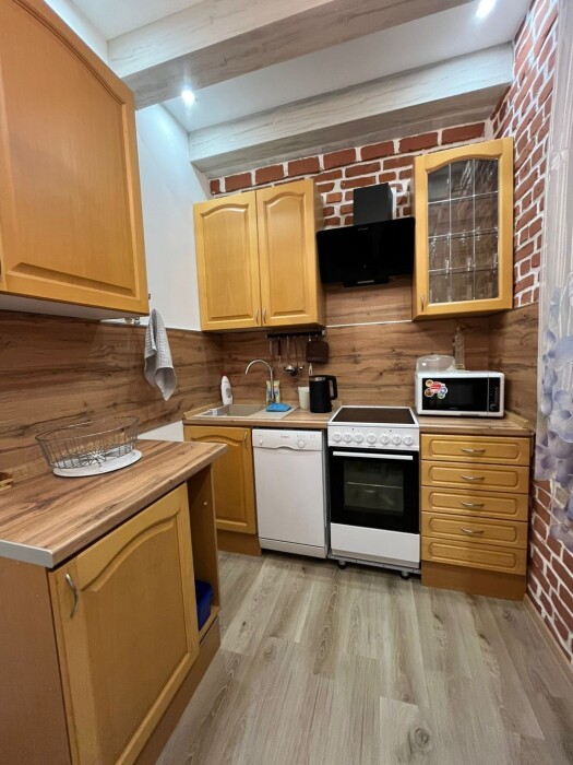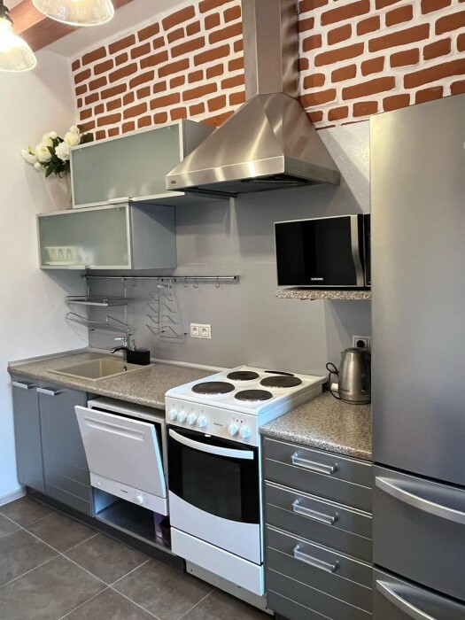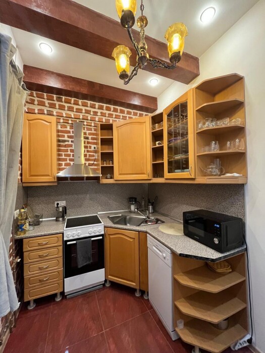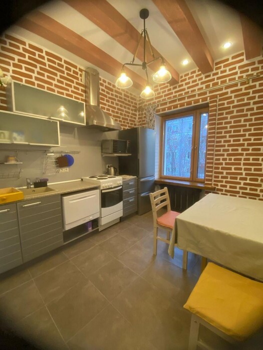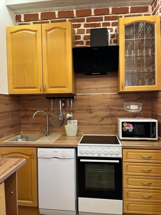 Кухни полностью укомплектованы всем необходимым, что делает процесс приготовления пищи приятным и простым. Высокие потолки и открытые фактуры стен придают интерьеру особый шарм.