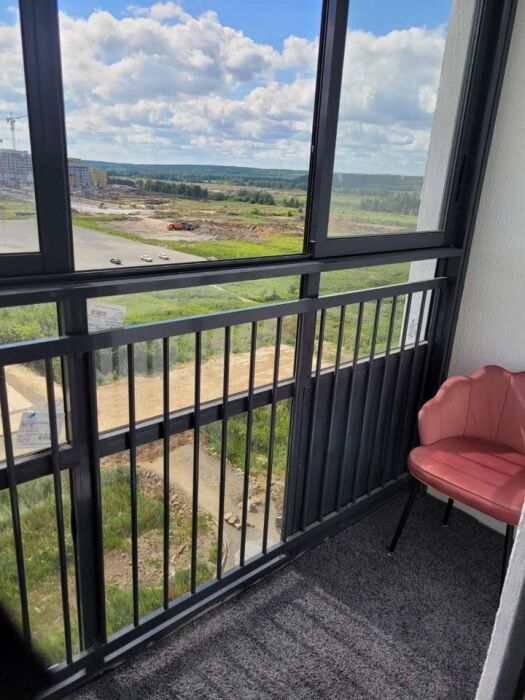 На балконе ковровое покрытие и кресло для приятного отдыха.