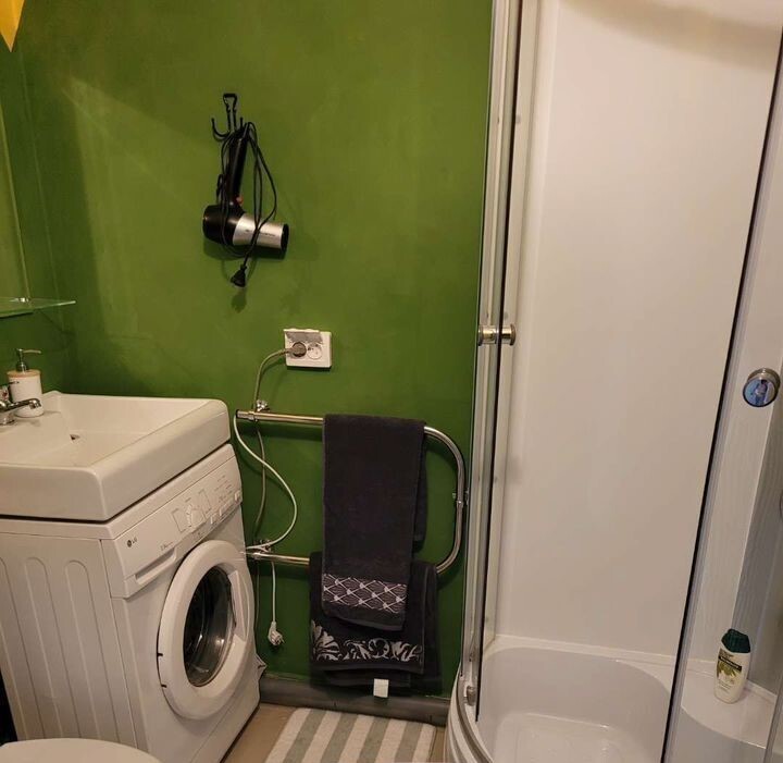 В ванной имеется гель для душа и мицелярная вода. Стиральная машина, порошок для стирки.