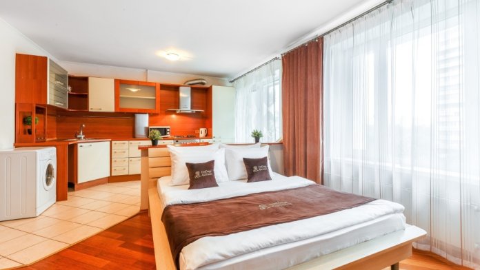 В большой, светлой комнате находится 2-х спальная кровать, шкаф для одежды. Кухня оборудована всем необходимым для приготовления вкусных обедов. В квартире имеется вся необходимая бытовая техника: ЖК-телевизор, стиральная машина, электрический чайник, СВЧ, фен, утюг, гладильная доска, на кухне вся необходимая посуда. Для приятного времяпрепровождения к вашим услугам безлимитный интернет Wi-Fi и кабельное TV.