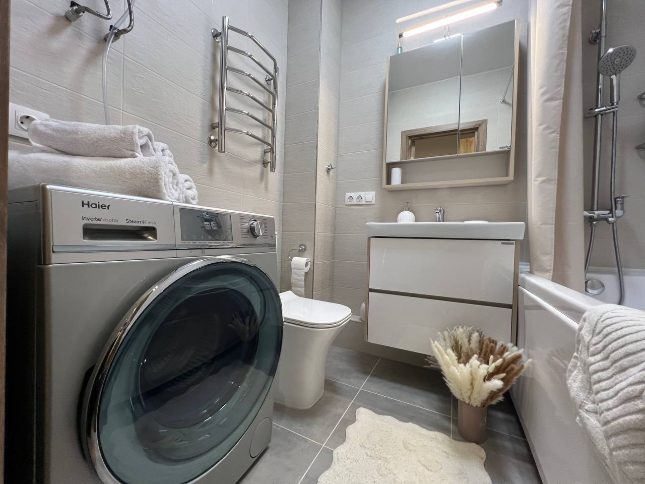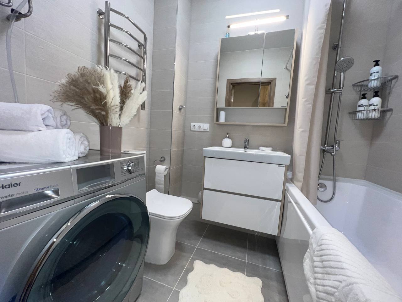 Техника: холодильник, чайник, плита, микроволновка, стиральная машина, утюг, фен, кондиционер. Есть всё для приготовления еды, а также сушилка и гладильная доска.