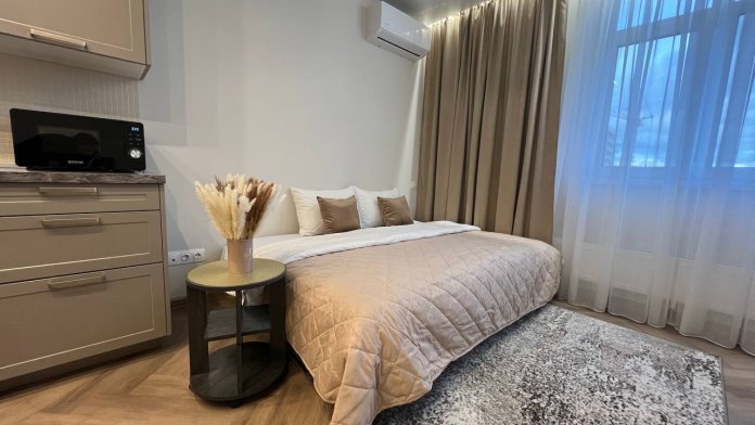 Студия: 1 комната, 1 диван. Для Вас готово свежее постельное бельё (100%-й хлопок) и полотенца. В квартире есть ванна. На этаже - балкон.