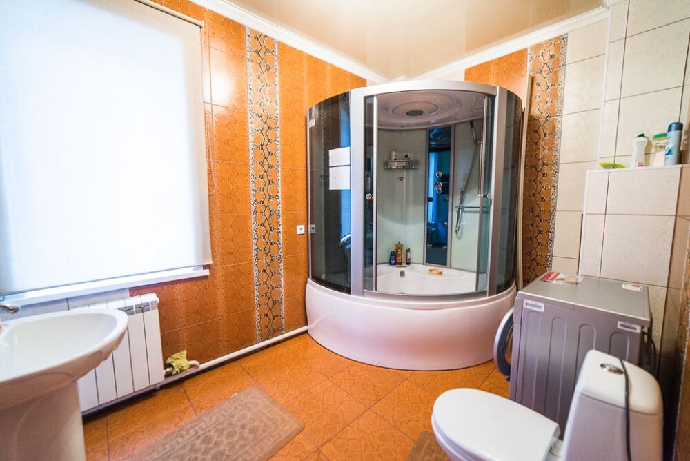 Пол по всей площади 1 этажа с подогревом (можно отключить если жарко), шикарная лестница из березы, пологая, что идеально для маленьких детей. Три санузла. На 1 этаже душевой бокс: джакузи, баня, массажер для ног, струйный массаж всего тела. На 2 этаже 2 изолированные спальни, в каждой огромная 2-спальная кровать, диван 2-местный и 2 прикроватные тумбочки, стойка для одежды.