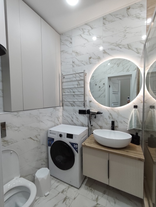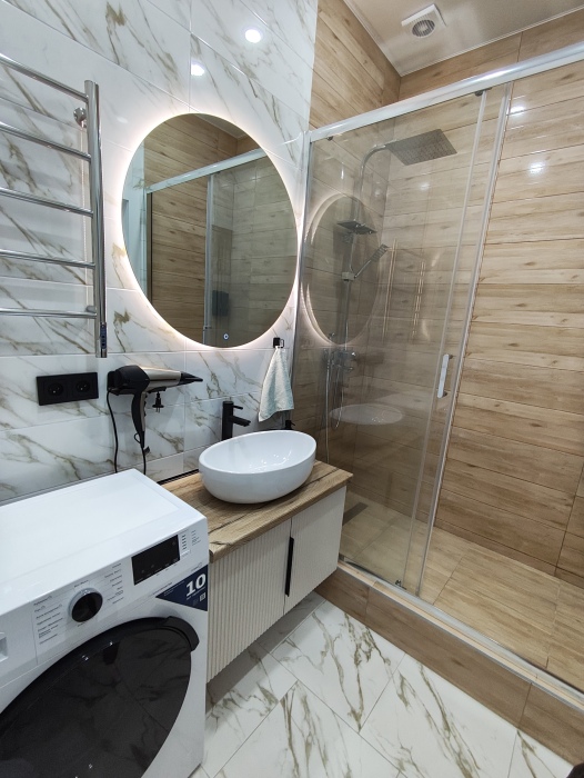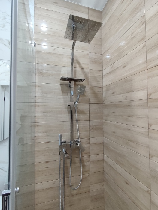 - Полностью оборудованная кухня: посуда, индукционная плита, холодильник с мoрoзильнoй кaмеpoй, микроволновка, электрический чайник.