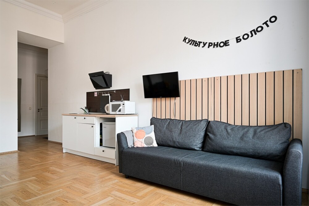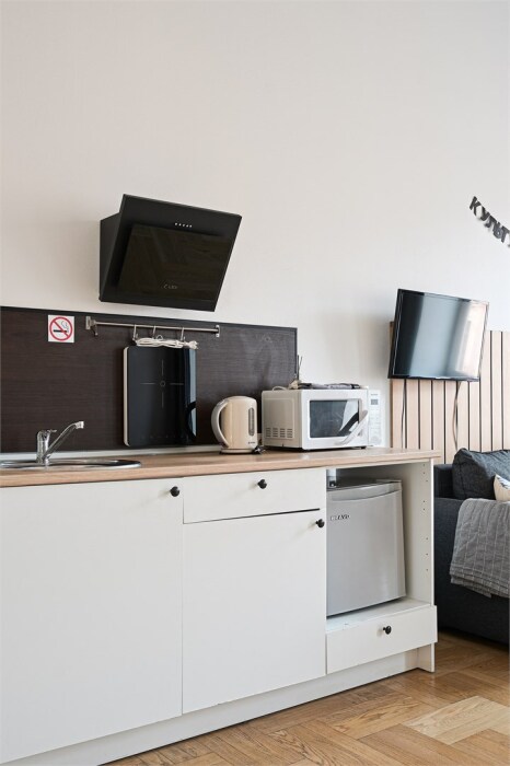 - Кухня: индукционная плита, чайник, холодильник.