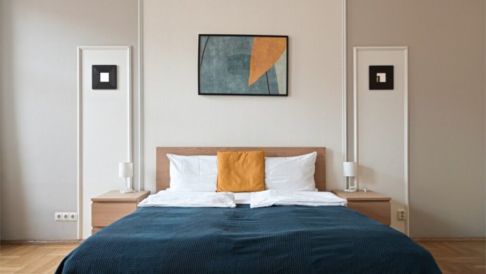 - Двуспальная кровать шириной 160 см, диван и раскладушка в спальне.