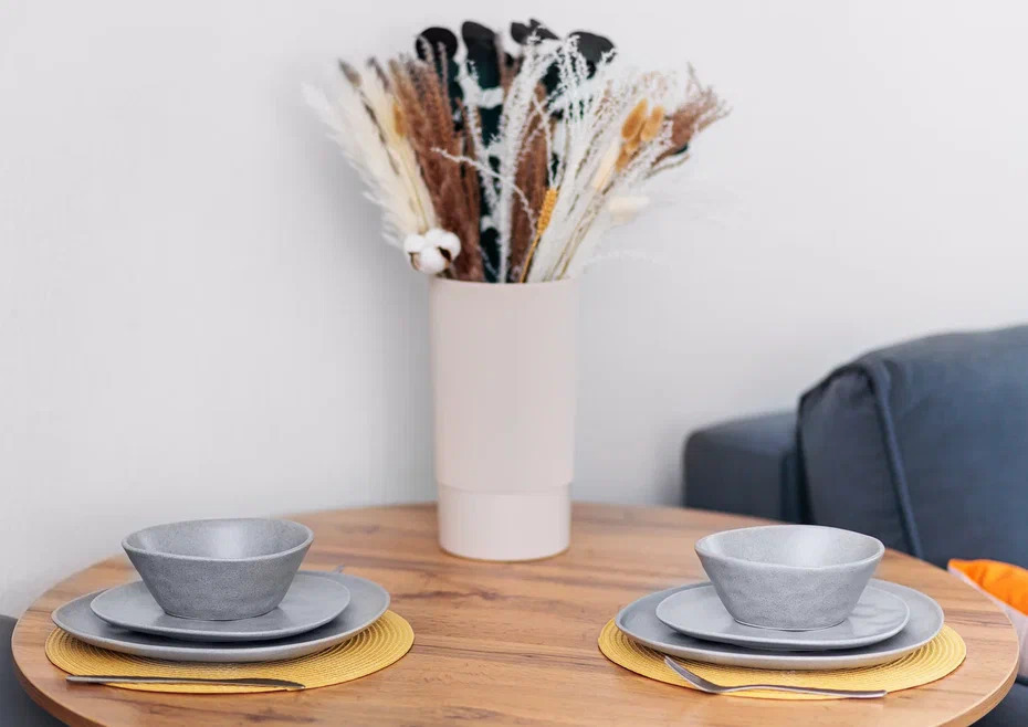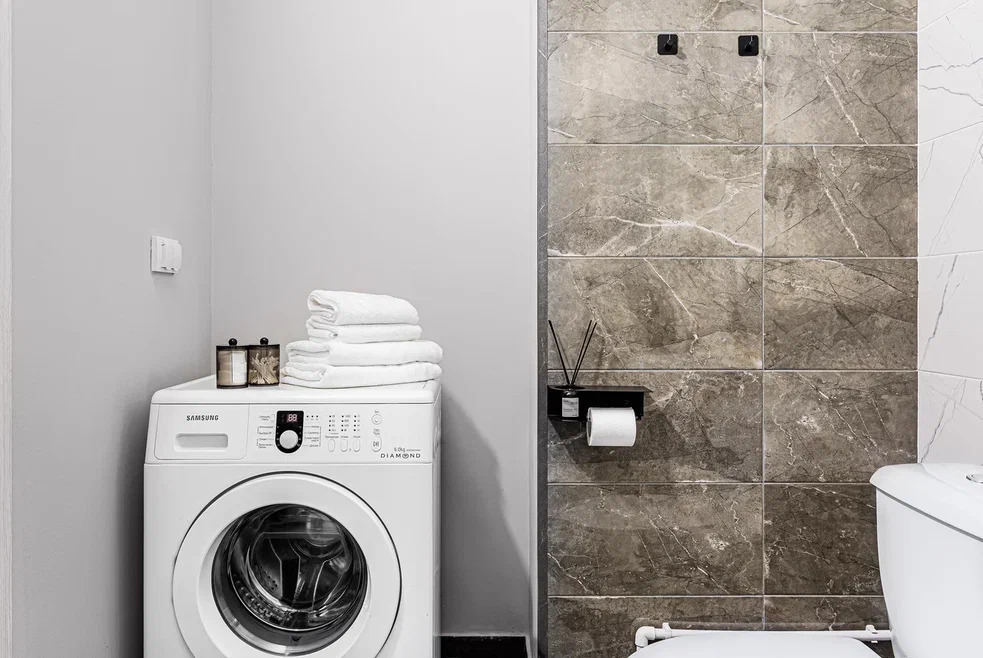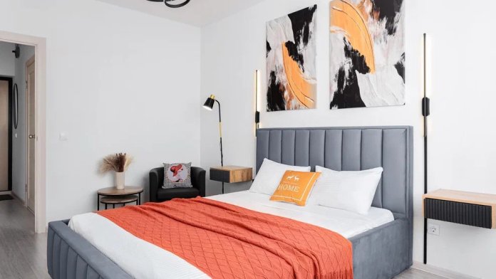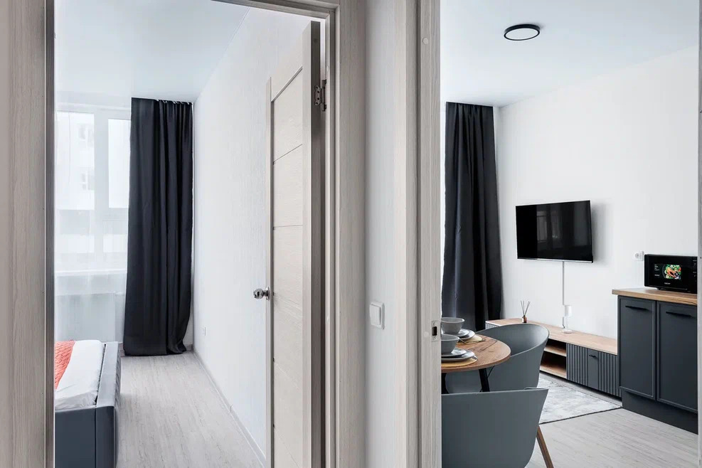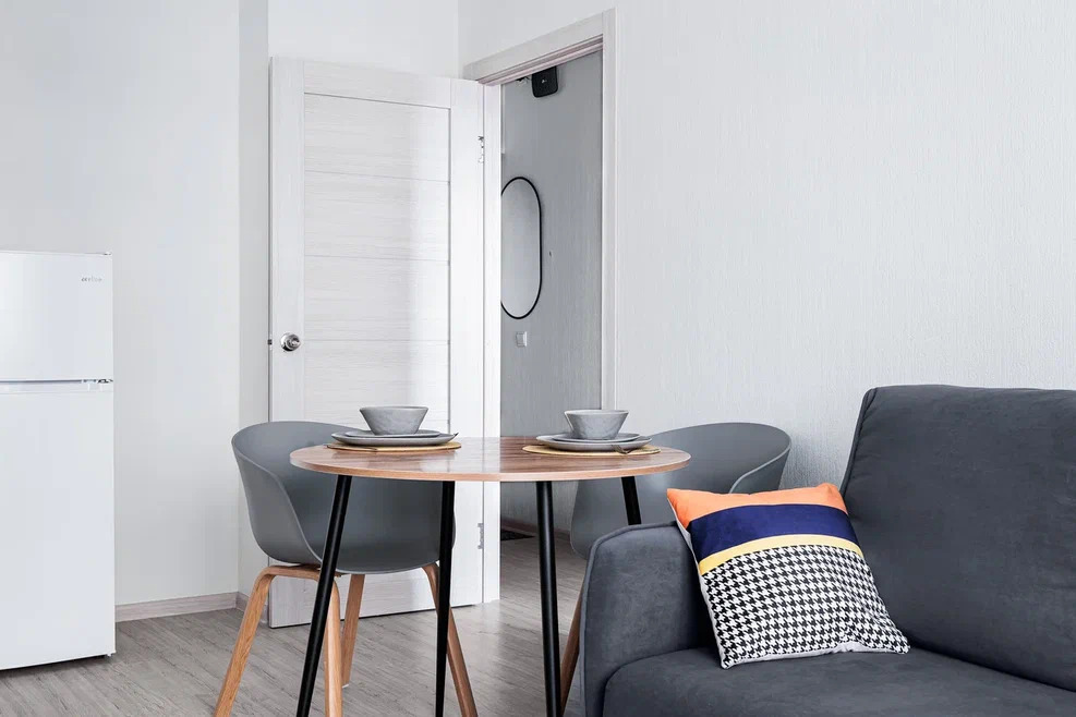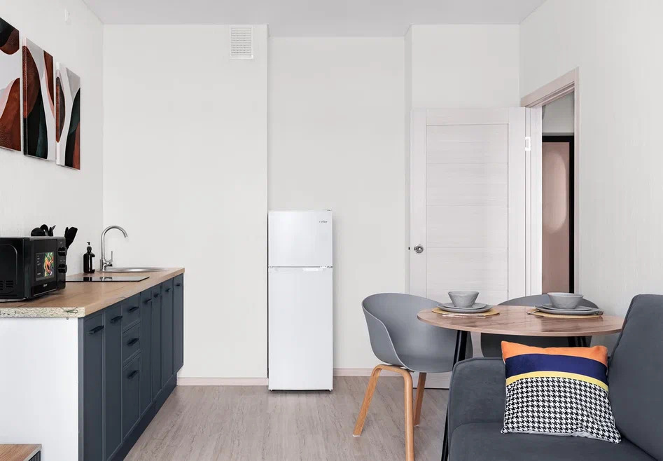Современная мебель, посуда, бытовая техника. Заправленное постельное белье, полотенца, одноразовые губки, тряпочки. На кухне есть вся необходимая посуда для приготовления пищи.