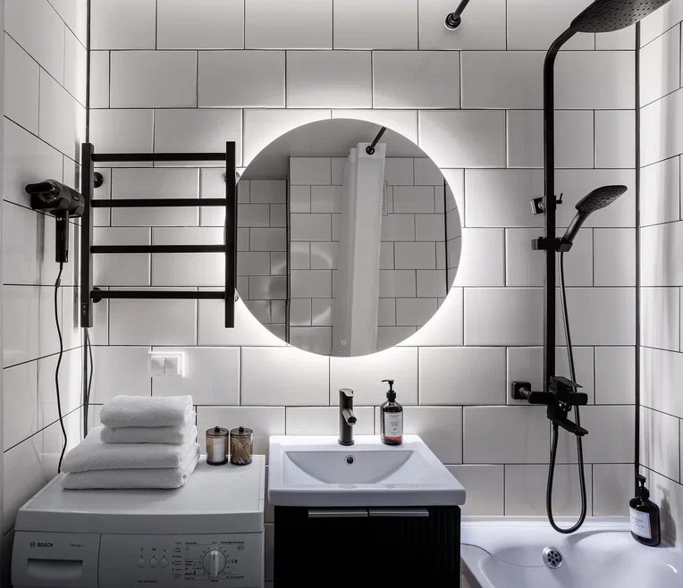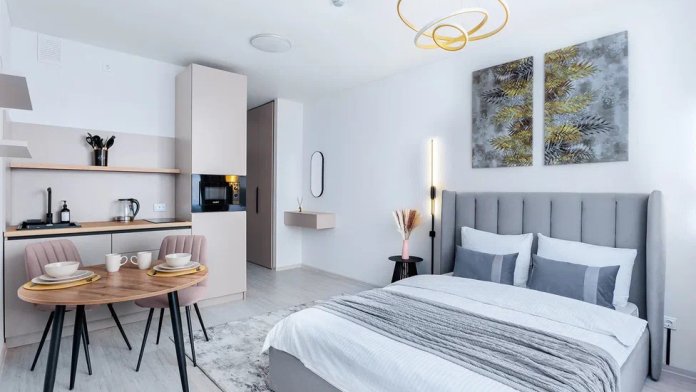 Современная мебель, посуда, бытовая техника. Заправленное постельное белье, полотенца, одноразовые губки, тряпочки. На кухне есть вся необходимая посуда для приготовления пищи.