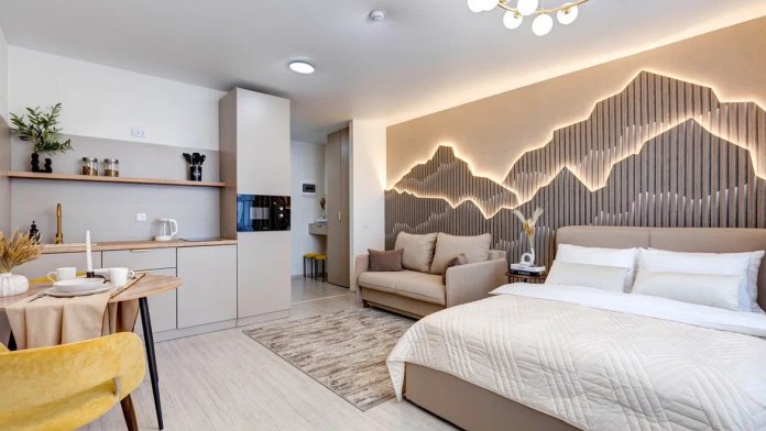 - Удобная обеденная и кухонная зона с набором посуды, плитой, микроволновой печью;