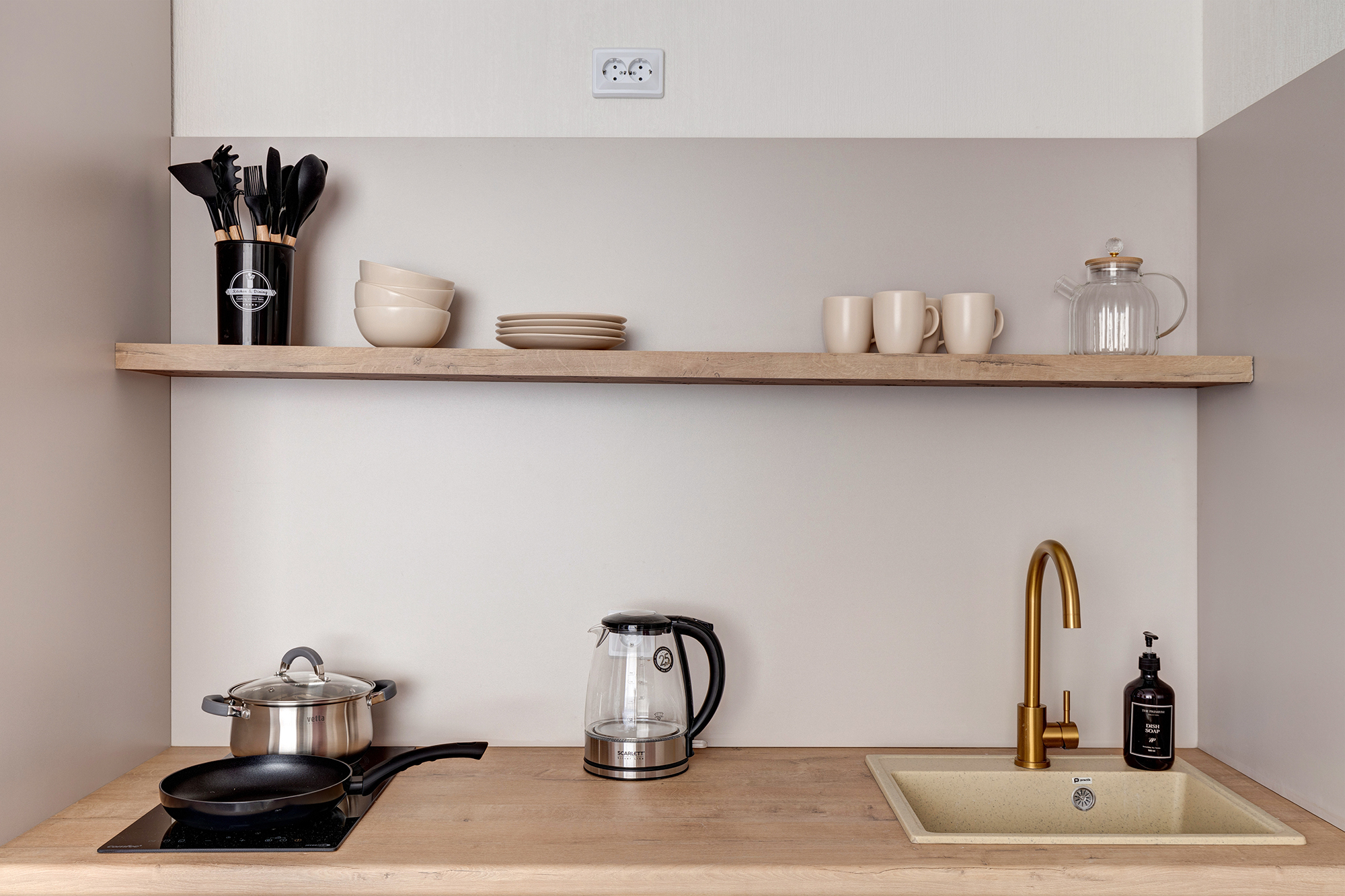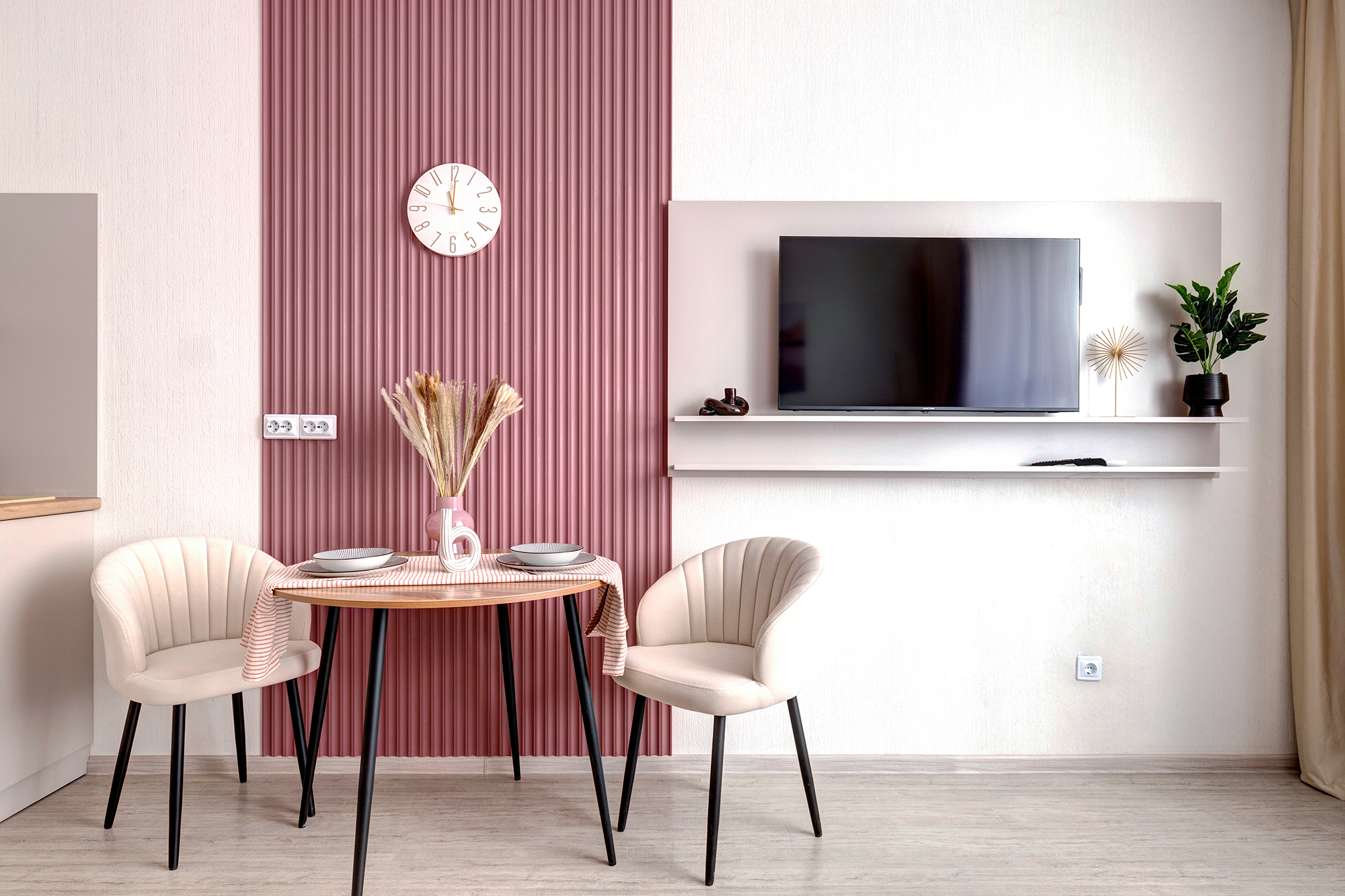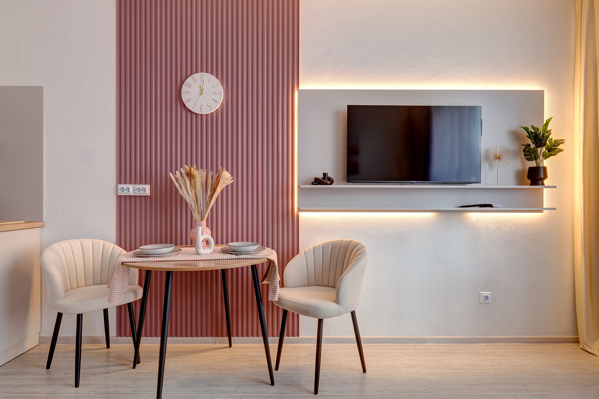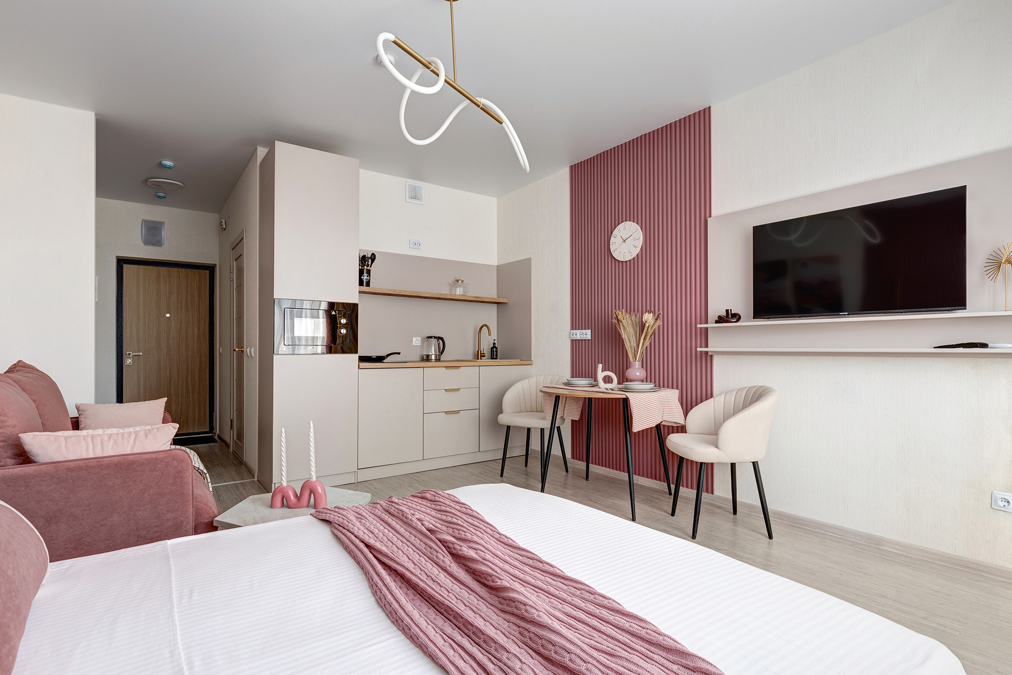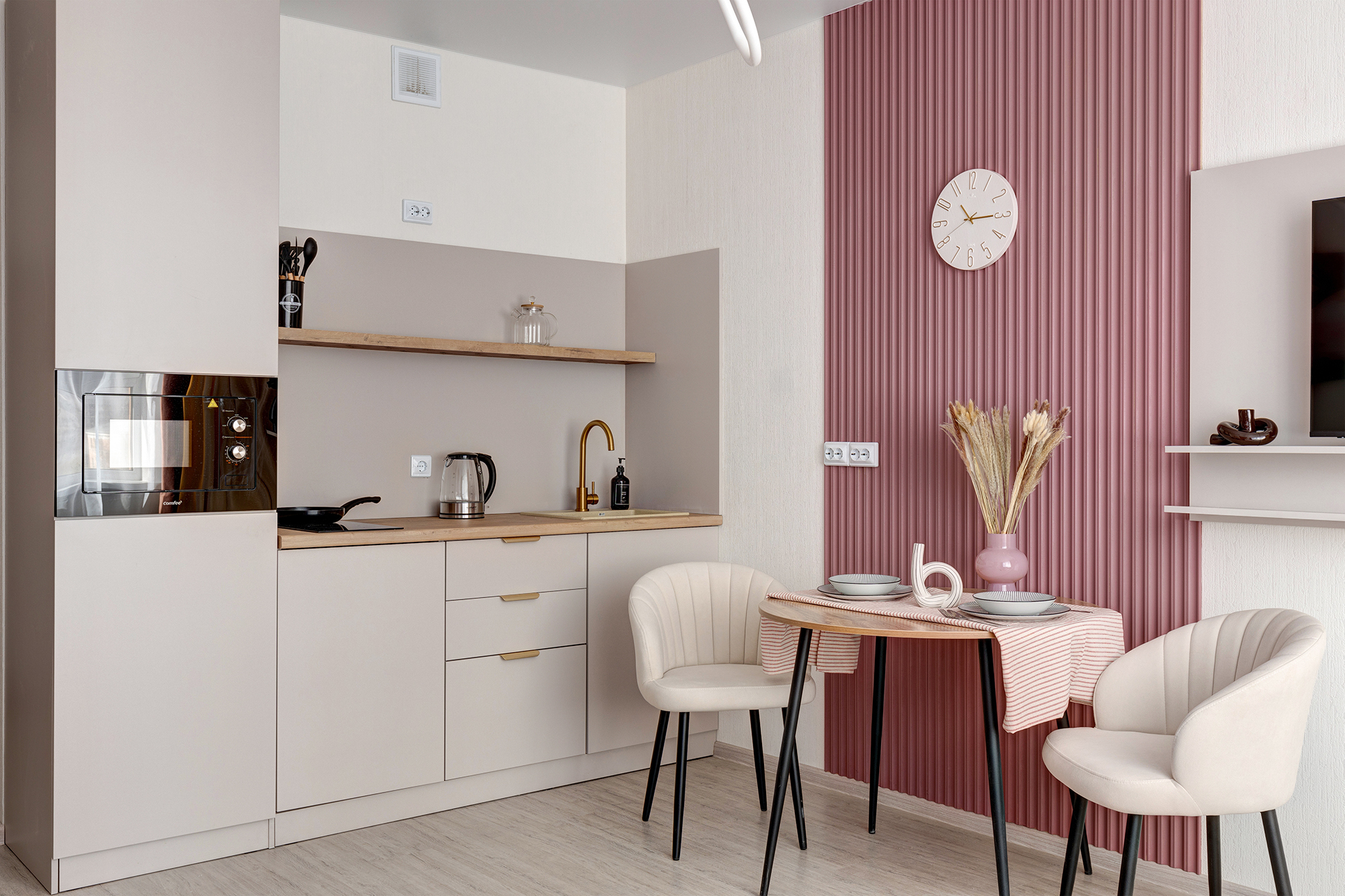 - Удобная обеденная и кухонная зона с набором посуды, плитой, микроволновой печью;