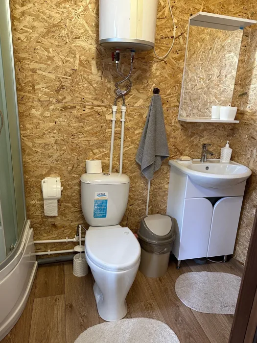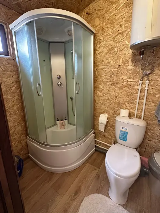 В доме кухня, вся кухонная утварь и посуда. Две комнаты для отдыха (5 спальных мест - диван двуспальный и 3 кровати односпальных), отопление печное (дрова имеются, входят в стоимость). Туалет и душ в доме. Бойлер на 50 литров. Постельное белье, полотенца входят в стоимость проживания.