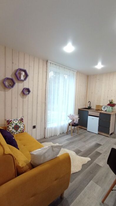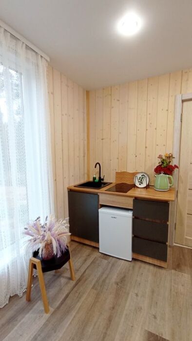 - полноценная кухонная зона с варочной панелью и холодильником.