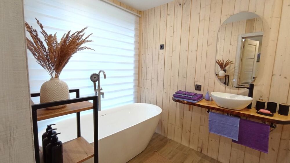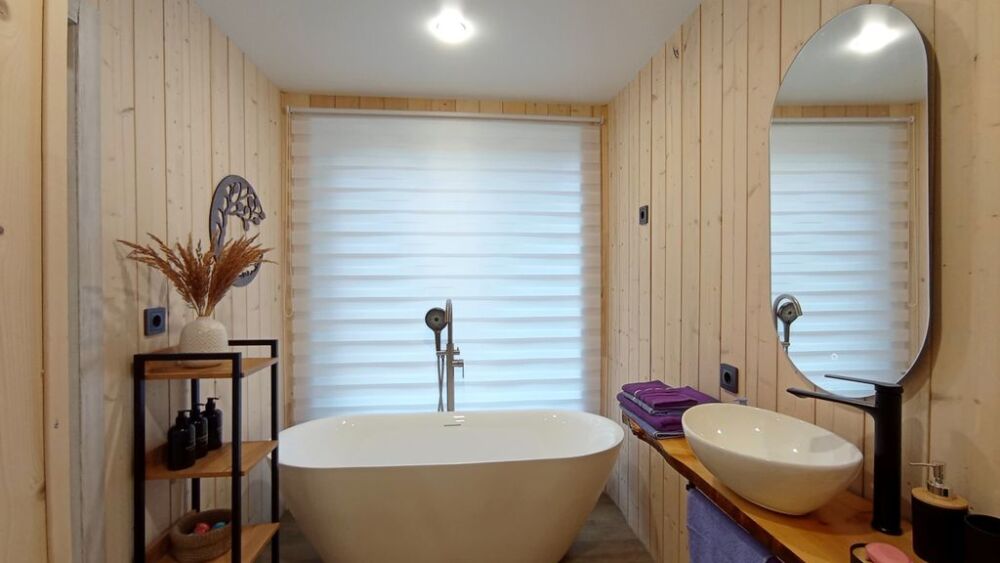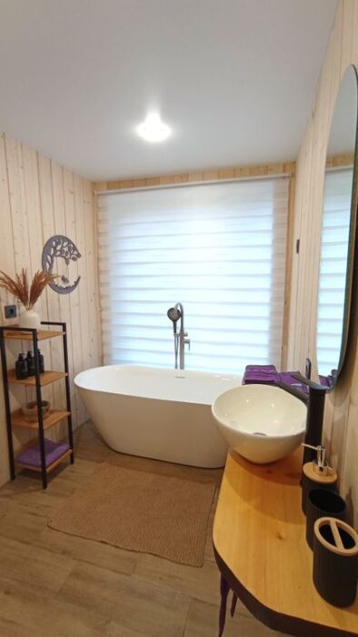 - комфортная ванная комната с панорамным окном и видом на лес.