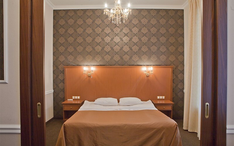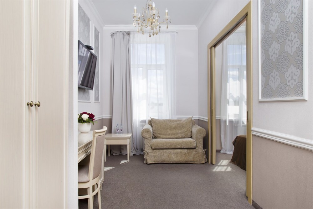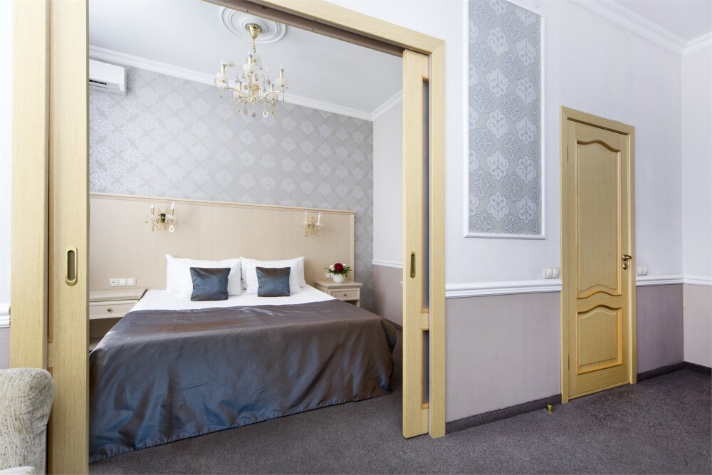 Двухкомнатные номера Люкс, отличаются просторностью и потрясающим видом на реку и крыши старого города с верхнего этажа отеля. Благодаря такому виду гости могут чувствовать особый дух Петербурга, его характер и настроение. В номере Люкс две комнаты, одна из которых оснащена двуспальной кроватью, а вторая с раскладным диваном. Таким образом, номер вмещает 4 гостя. Также, мы можем поставить детскую кроватку для малыша и отдельное дополнительное место.
