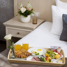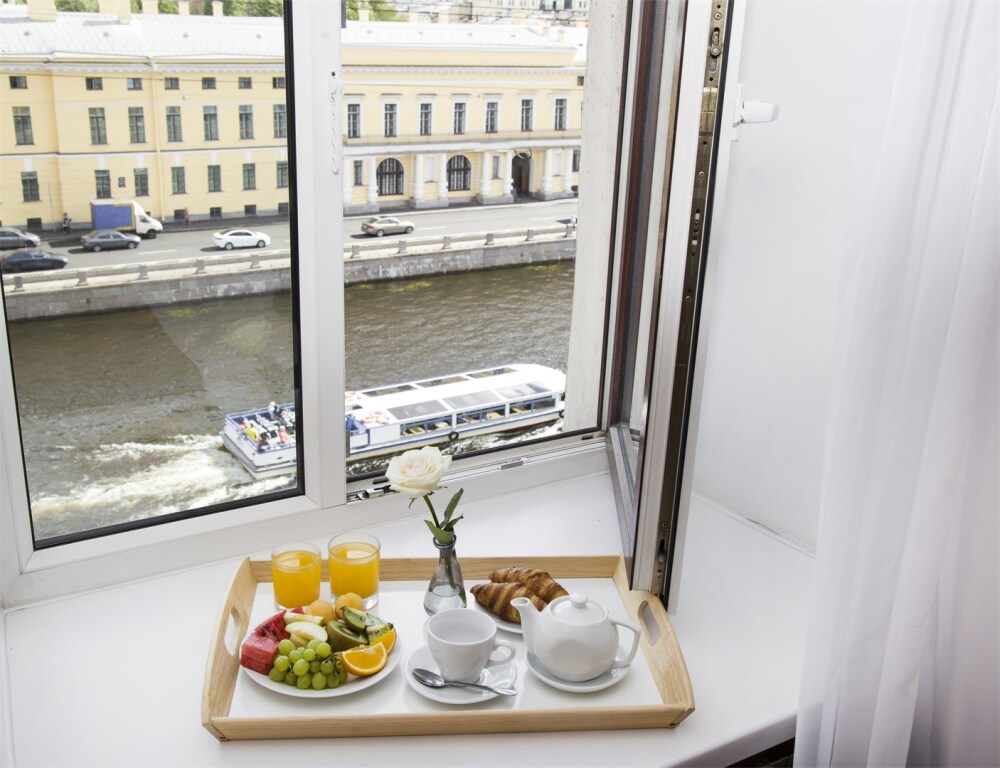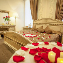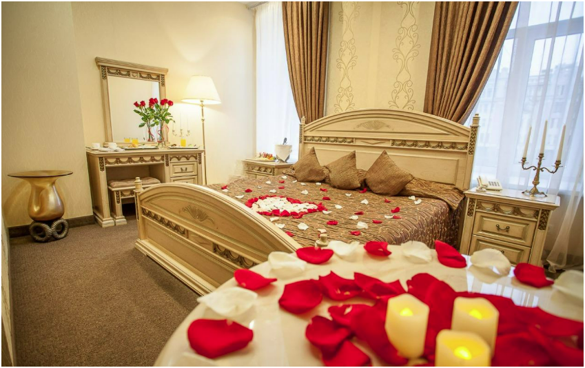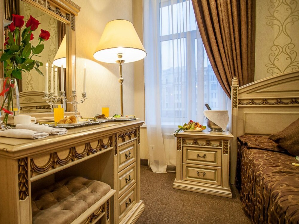 Идеально подойдёт для молодожёнов и особенного случая. Оформление в золотисто-медовых цветах, зеркальный потолок, большая двухместная ванна джакузи создадут особое настроение Вашего дня. Дополните проживание одним из наших пакетов с украшением номера лепестками роз, свечами, фруктами и игристым вином для создания волшебной романтической атмосферы. С нашим пакетом утром Вам принесут завтрак, чтобы Вы насладились утренним кофе и видом на набережную реки Фонтанки из Вашего номера.