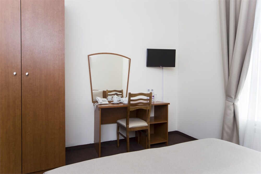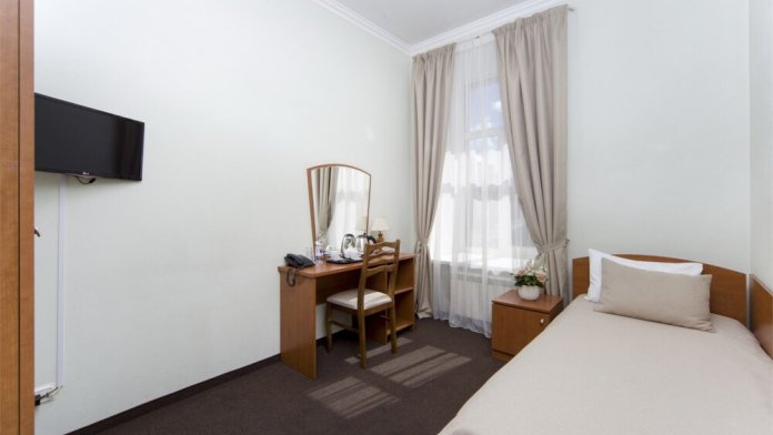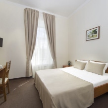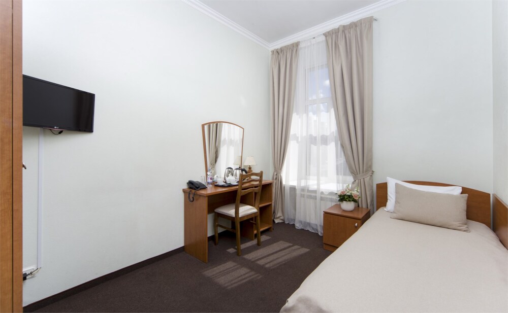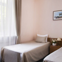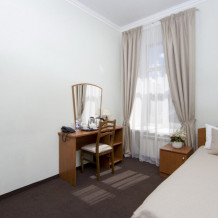 Уютный стандартный номер с односпальной кроватью для проживания одного гостя. Номер оформлен в классическом стиле и светлых тонах, располагает собственной ванной комнатой с душевой кабиной, мягкими полотенцами, туалетными принадлежностями и тапочками. В номере высокие потолки и ковровое покрытие для комфорта наших гостей и шумоизоляции. Возможна установка детской кроватки для малыша.