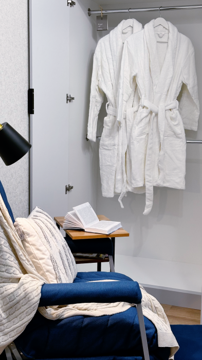 * Полотенца, халаты, утюг, аптечка, фен и тапочки — максимум уюта и заботы о вас.