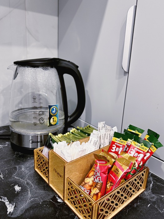 * Полностью оборудованная кухня с посудой, небольшим запасом продуктов, чая и кофе — всё, чтобы почувствовать себя как дома.