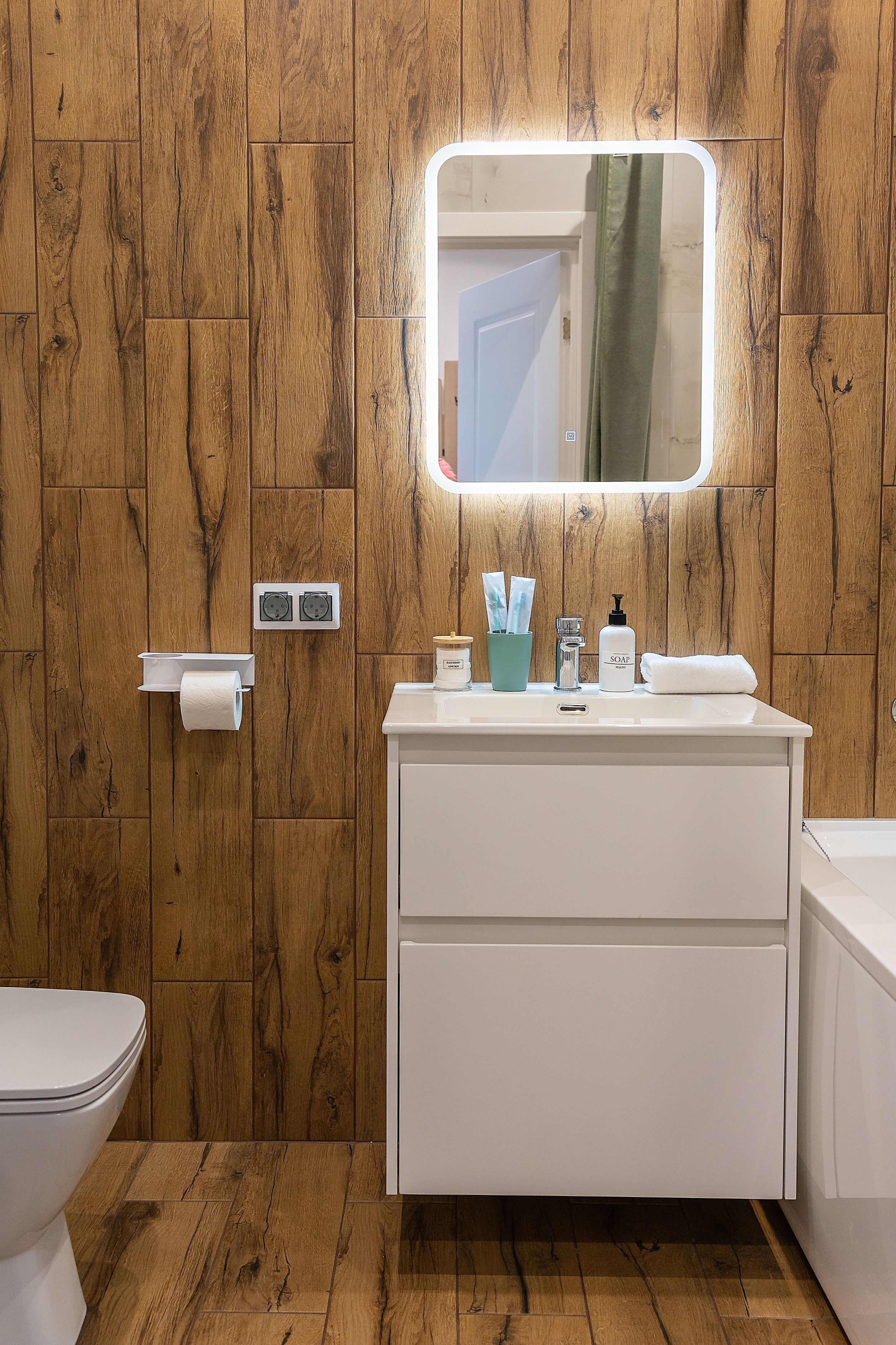 - Ванная: фен, стиральная машина, гель для стирки вещей, шампунь, гель для душа, жидкое мыло; утюг, гладильная доска, сушилка для Вашего белья после стирки, тёплый пол.