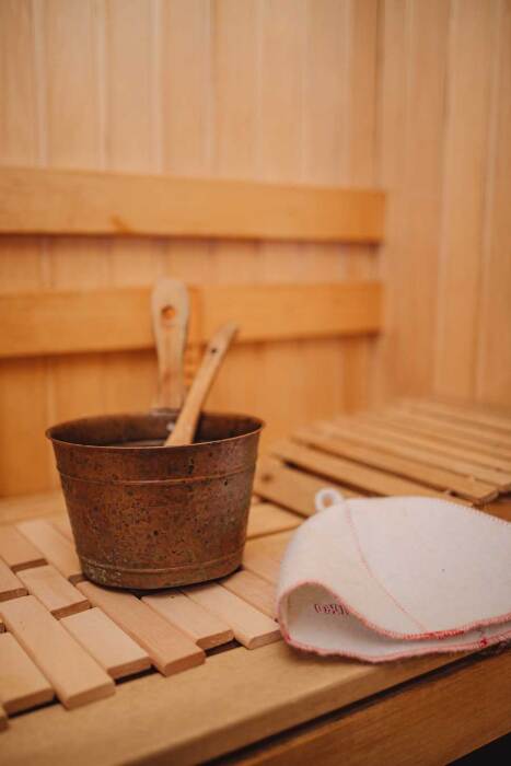 Кухня, гостиная, спортзал, сауна с комнатой отдыха, бытовое помещение, 3 спальни, 3 санузла.