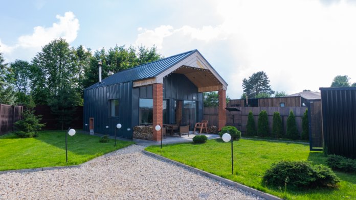 Осенние вечера становятся особенно уютными в этом доме с собственной баней. Здесь легко насладиться теплом и комфортом в окружении ярких красок природы.