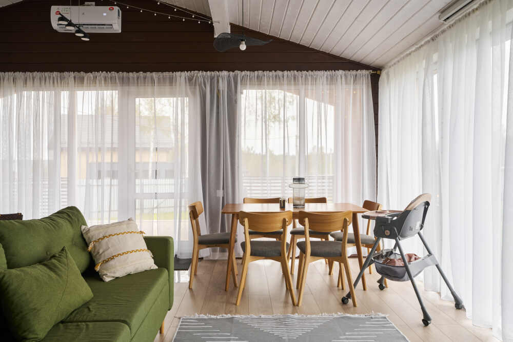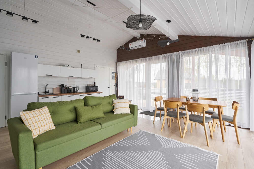 В доме — тёплый свет, удобная мебель, техника, посуда, свежее бельё, полотенца и базовые принадлежности. Всё готово для тех, кто ценит простоту, уют и атмосферу.