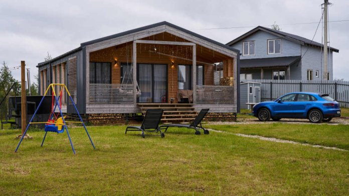 Стильный барнхаус с панорамными окнами, просторной террасой и большим участком в посёлке у озера Сенеж.