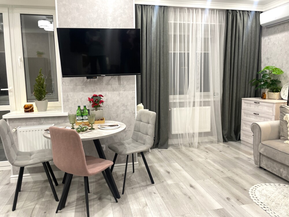 - чистая уютная квартира-студия с балконом, со всем необходимым для комфортного проживания (широкая двухспальная кровать 160×200; раскладывающийся диван; подушки и одеяла; посуда, средства гигиены, одноразовые тапочки, халаты, полотенца и т.д.);
