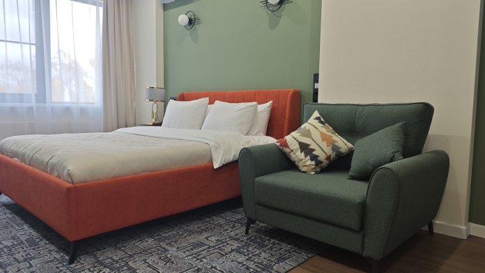 - Двуспальная кровать 160х200 и раскладное кресло для третьего гостя.