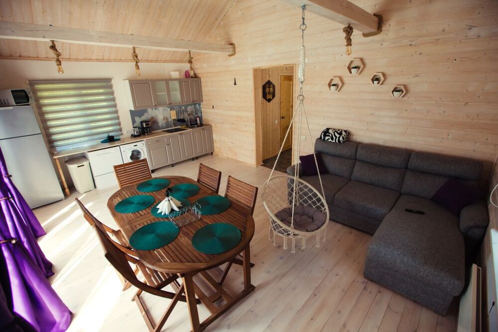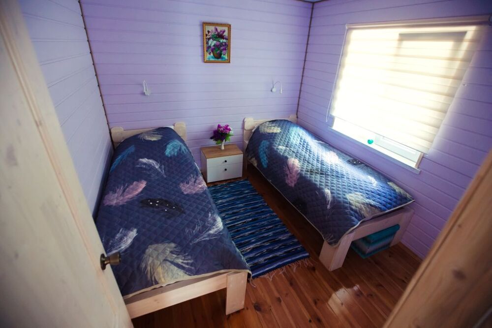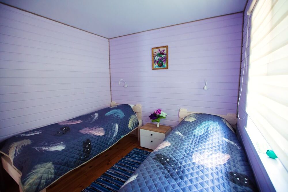 В доме две спальни, кровать 140*200, и две кровати 80*200, большая кухня с гостиной (диван раскладной160*200), совмещённый санузел, сауна (безлимитная), терраса, мангальная зона под крышей, на улице (шампура, решетка).