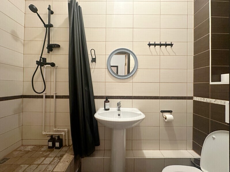 В квартире 6 комнат, 3 санузла, кухня с лаунж-зоной. Окна комнат выходят на спокойный, солнечный двор - в любое время суток у нас тихо. С общими удобствами.