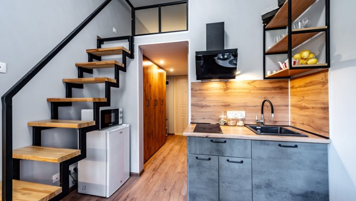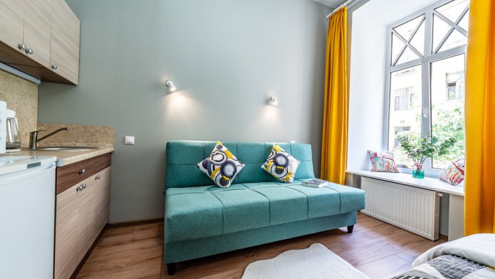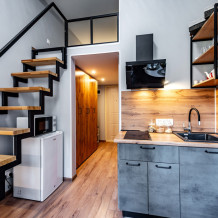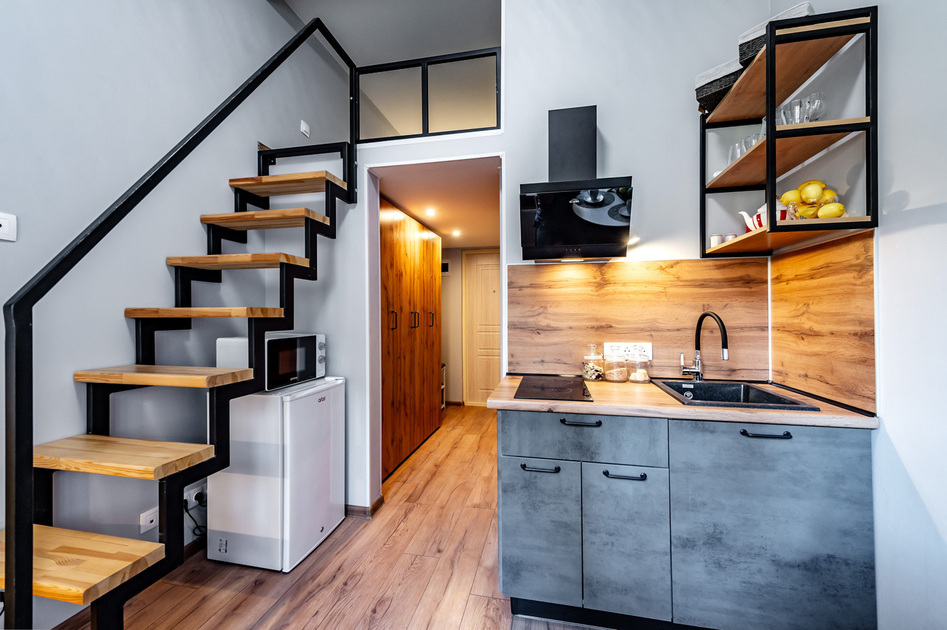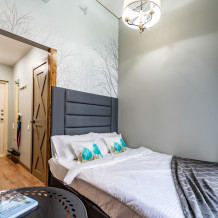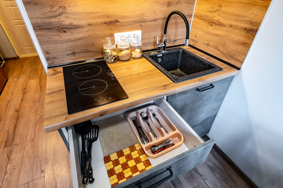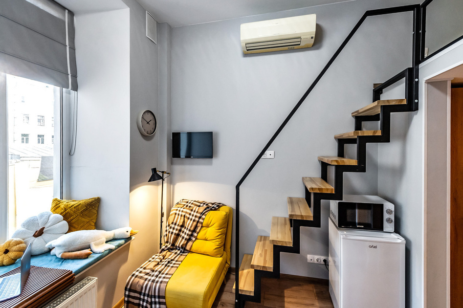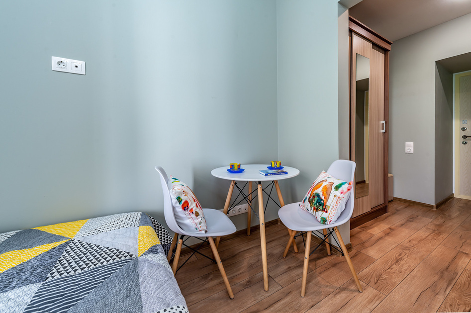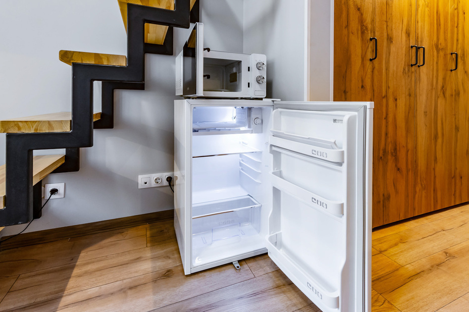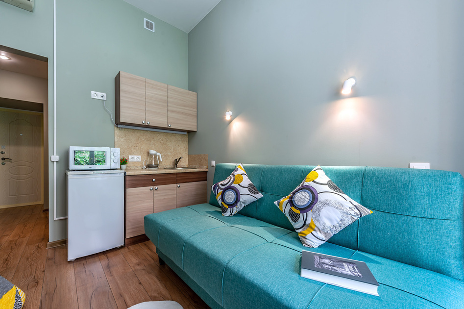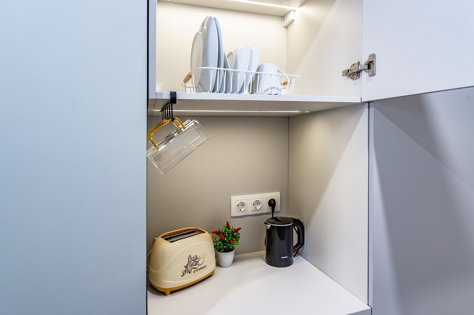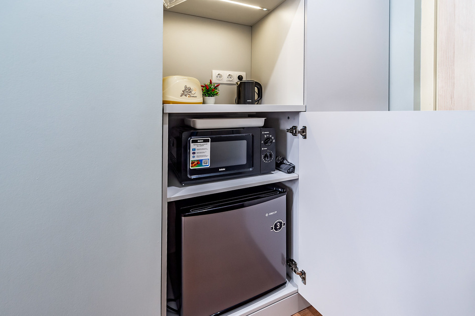 В апартаменте есть все для комфортного проживания: совмещенный санузел, двухспальная кровать с ортопедическим матрасом, банные принадлежности, Wi-Fi, холодильник, СВЧ-печь, электроплитка, тостер для приготовления завтраков, посуда, приборы, яйцеварка, мультиварка, чайник - всё необходимое для полноценного приготовления пищи. Кухни нет. Но вы всегда сможете приготовить обед, завтрак и ужин.
