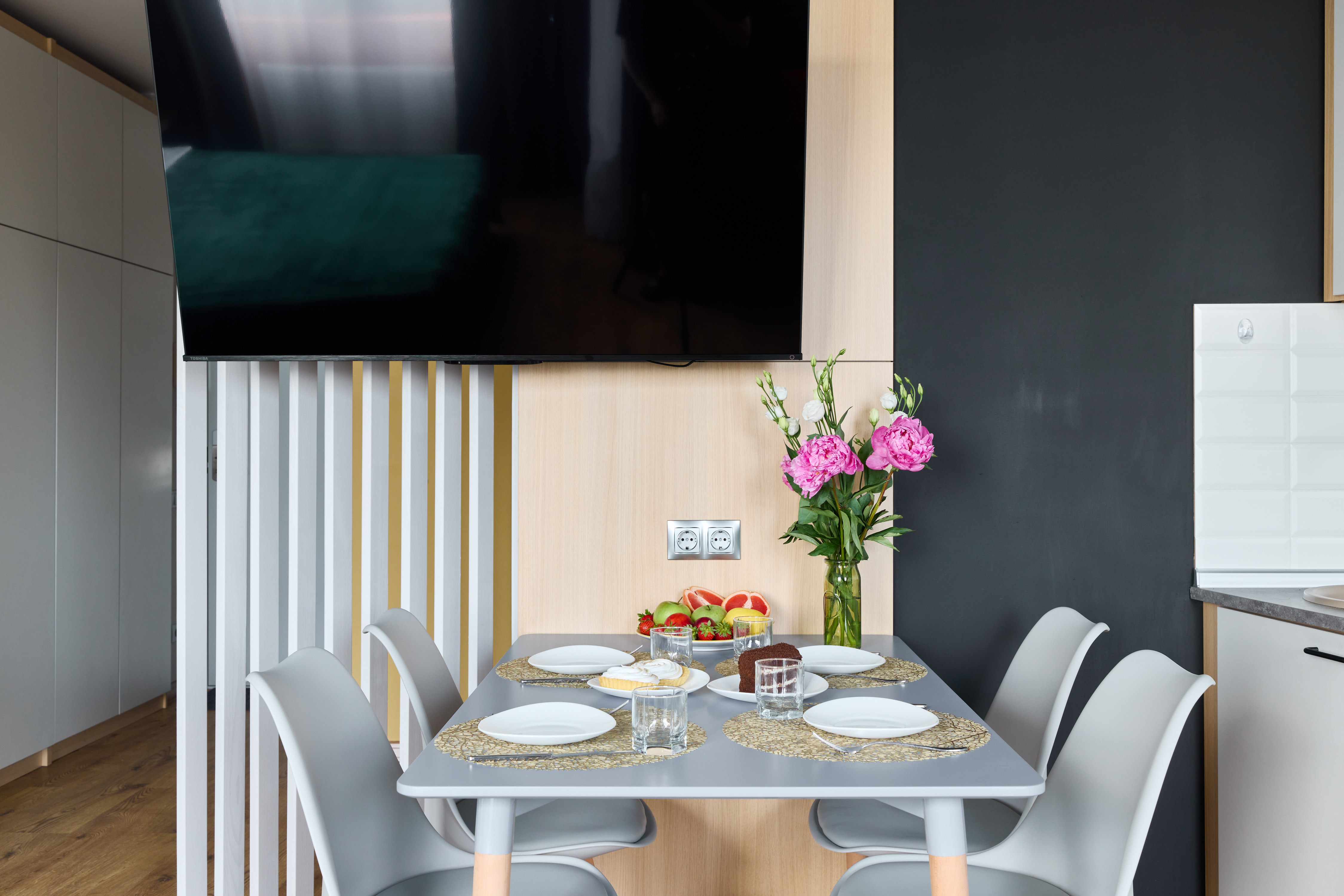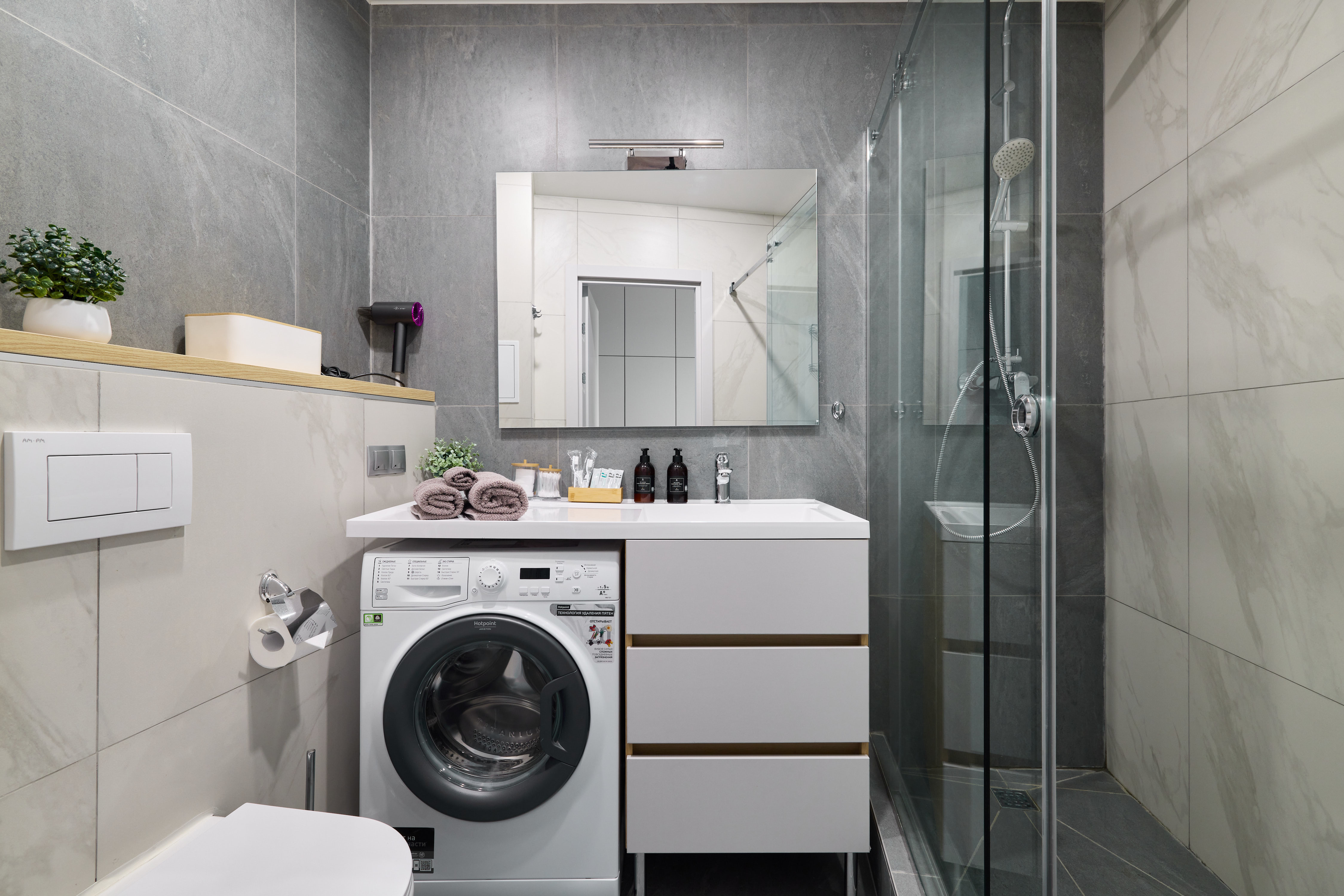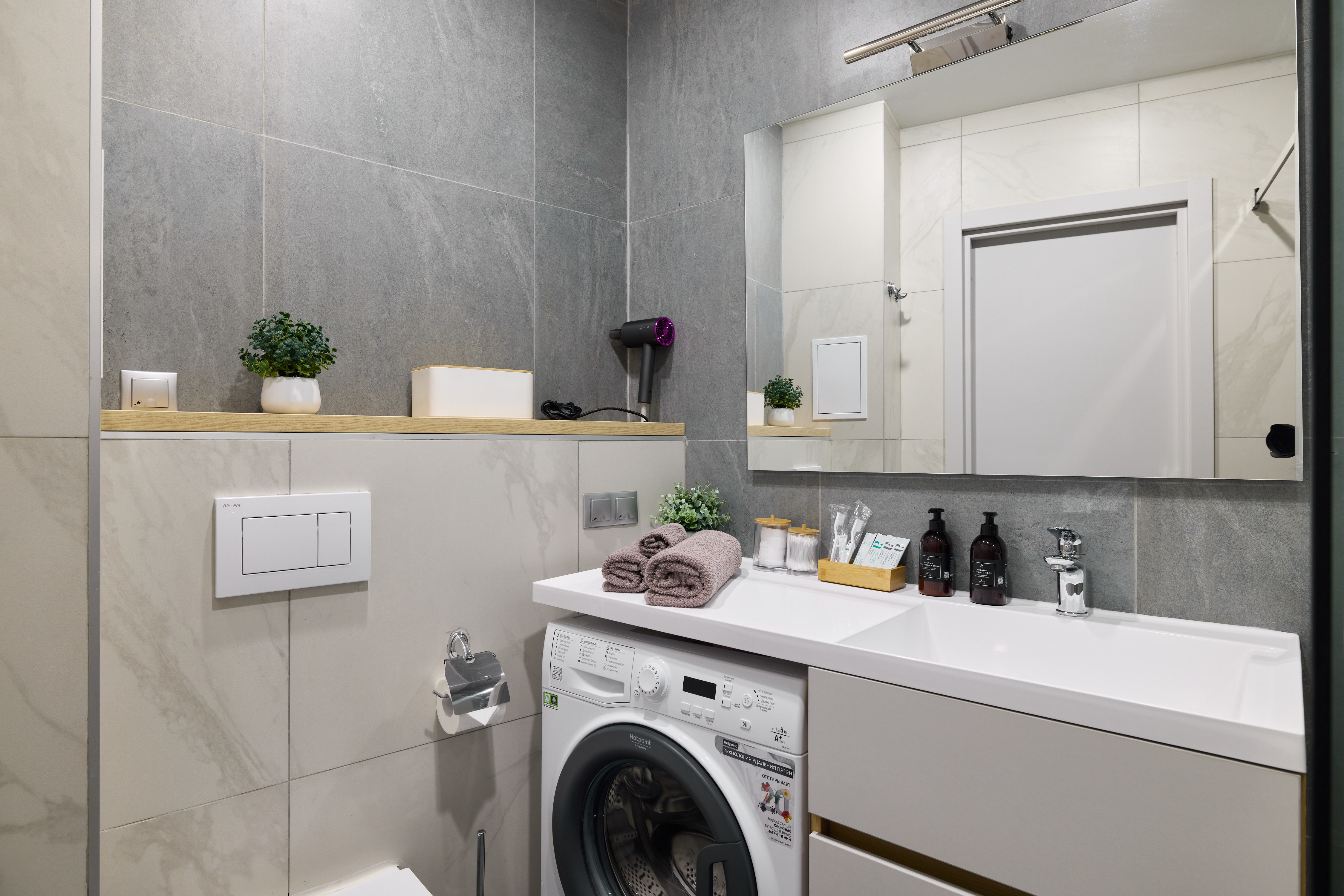 Студия разделена на зоны спальни и зону гостиной. В спальной зоне двуспальная кровать с ортопедическим матрасом повышенной комфортности, что позволяет проснуться утром отдохнувшим и полным сил (проверено нашими гостями!). Спальная зона отделена от гостиной текстилем. Студия так же будет удобна для семей с детьми. В квартире есть все необходимое из техники: плита, вытяжка, посудомоечная машина, стиральная машина и мелкая бытовая техника (чайник, кофемашина, тостер, бутербродница, фен, утюг). Большая (совмещенная) ванная комната с душевой, укомплектованная одноразовой косметикой и пушистыми полотенцами.