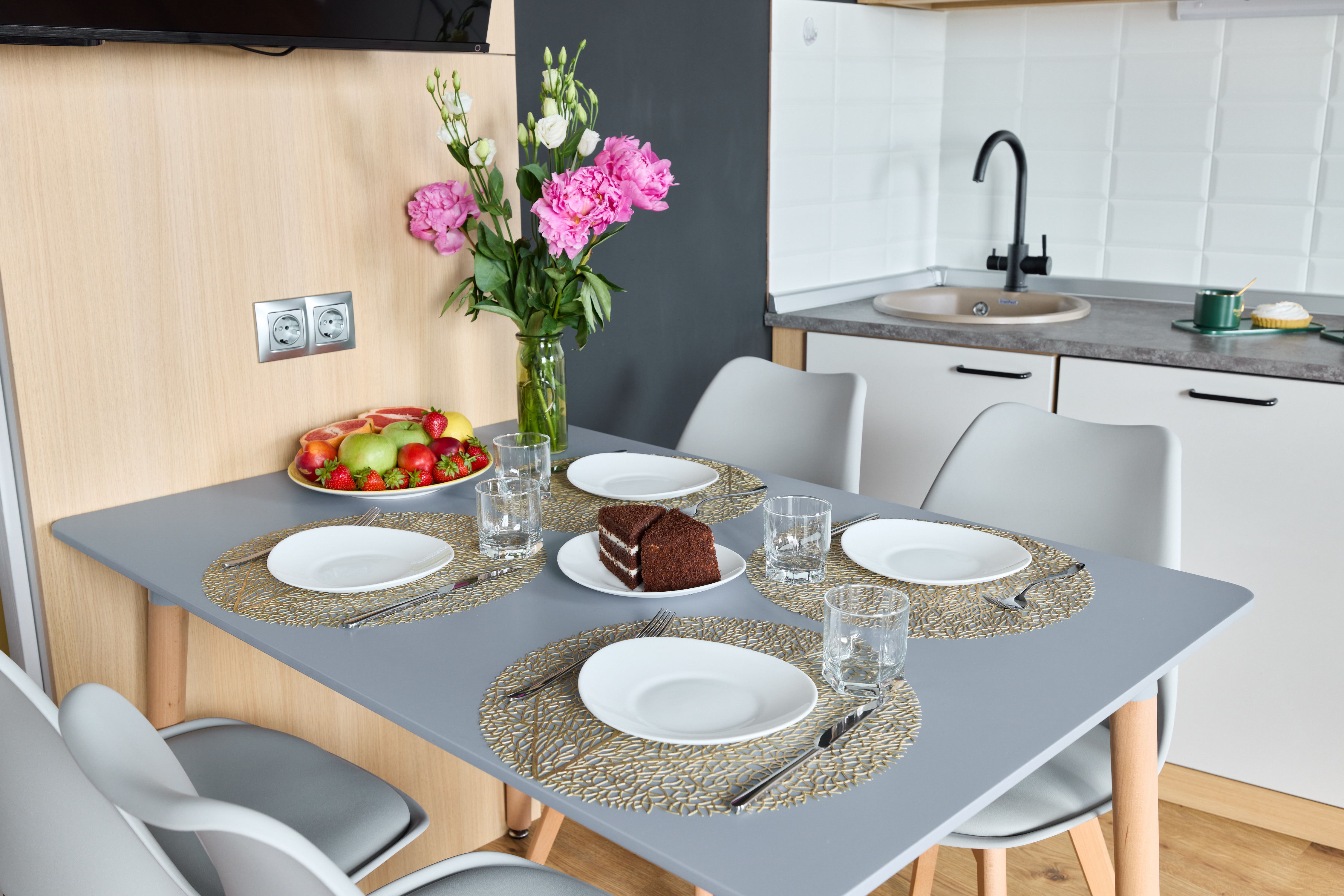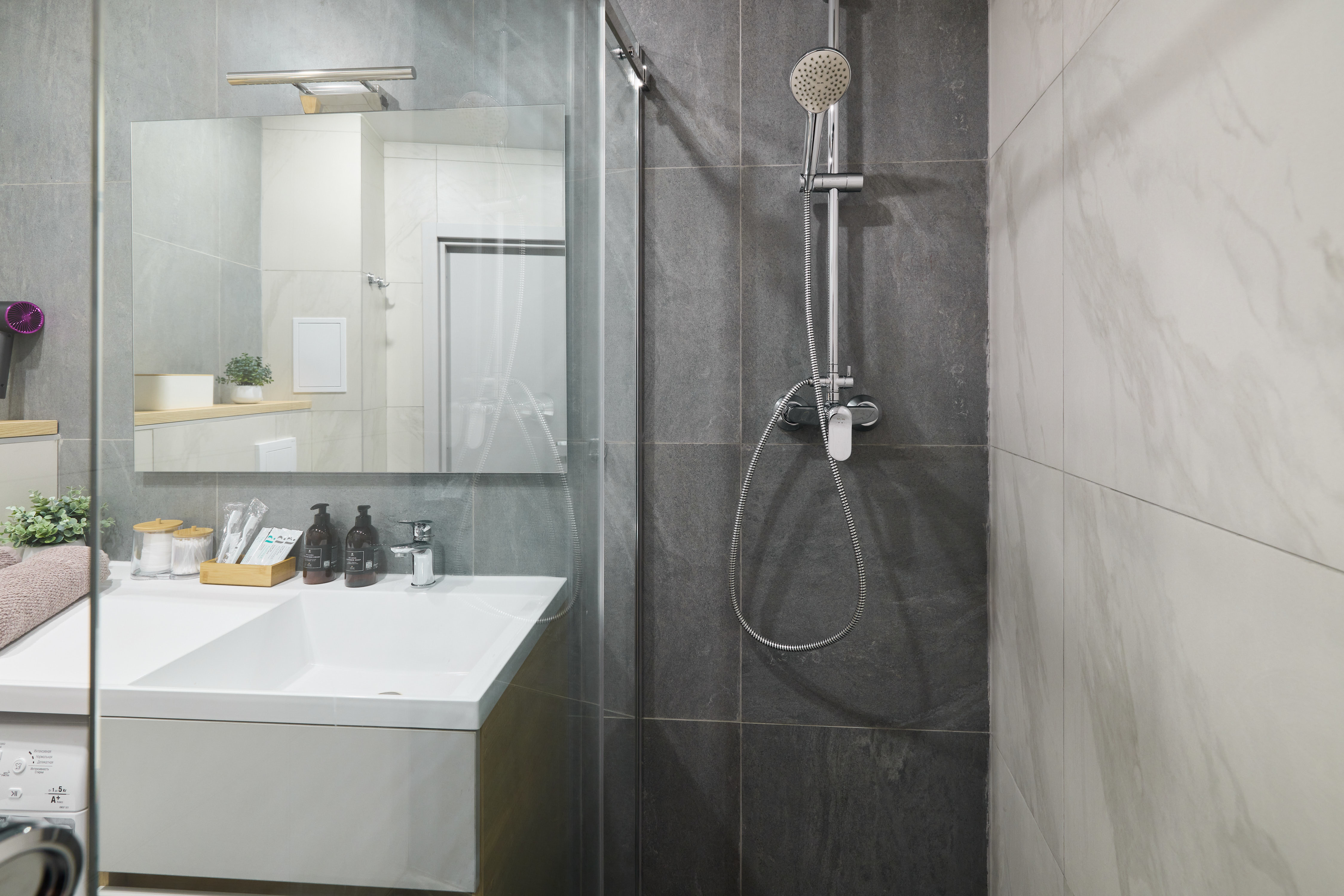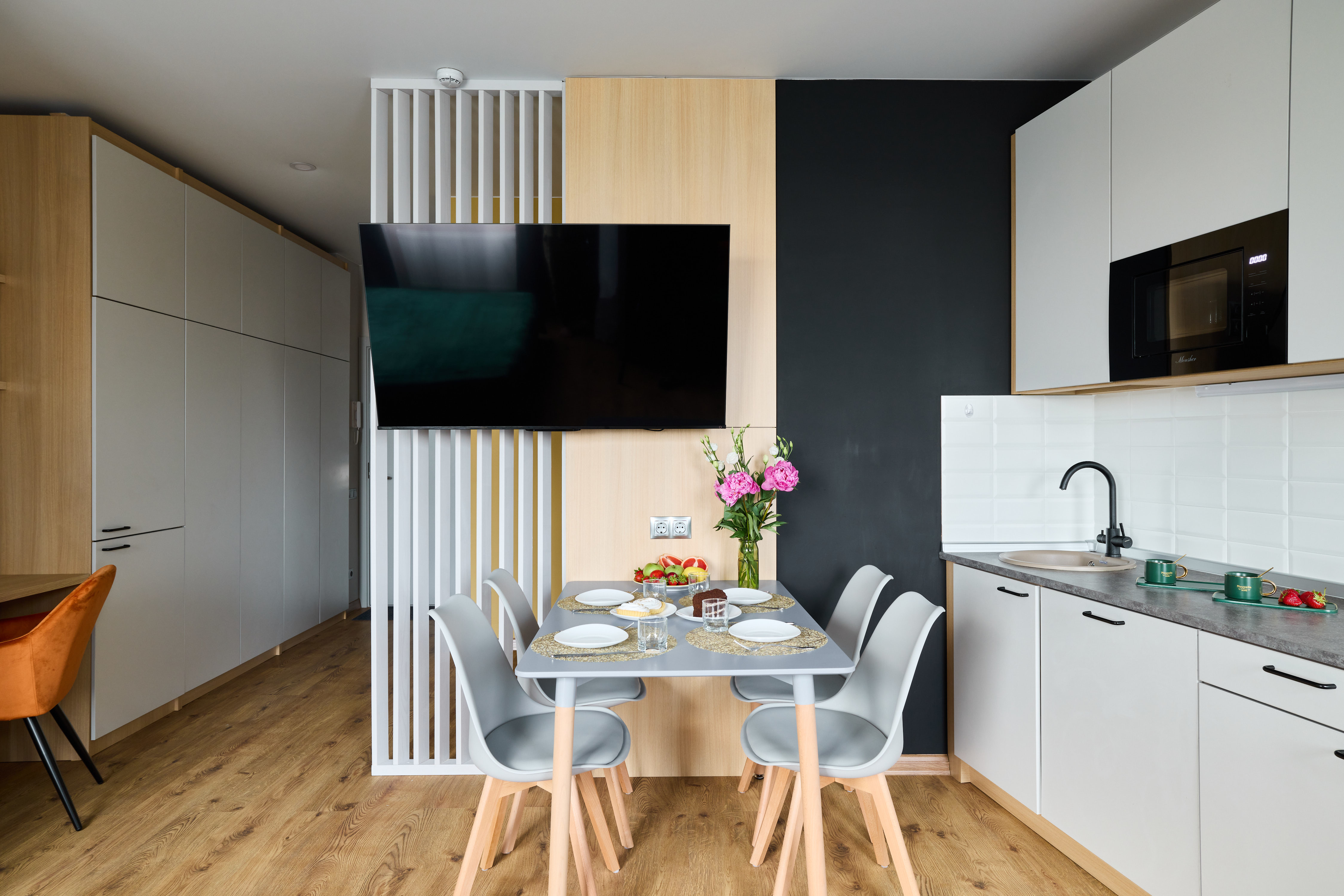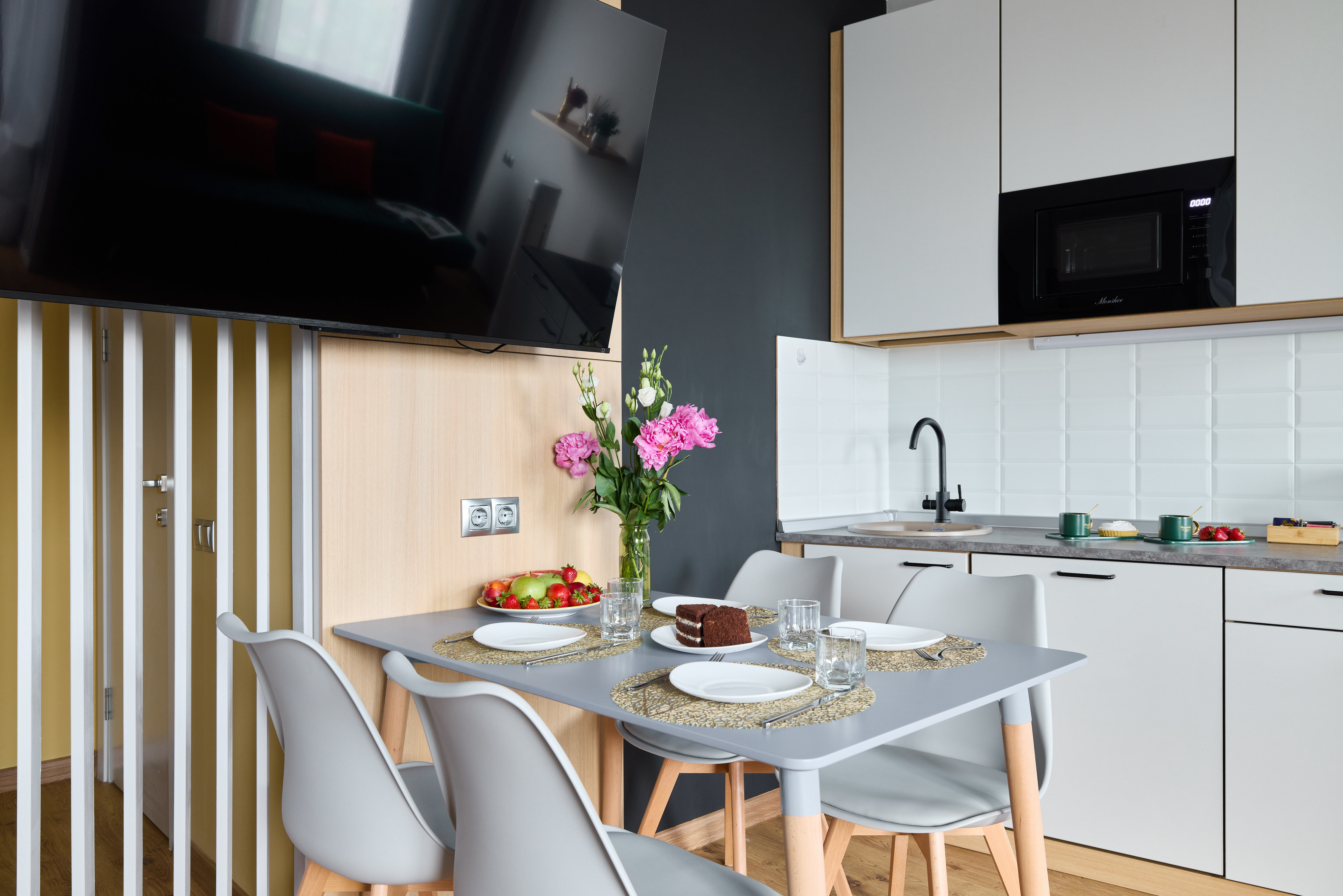 Студия разделена на зоны спальни и зону гостиной. В спальной зоне двуспальная кровать с ортопедическим матрасом повышенной комфортности, что позволяет проснуться утром отдохнувшим и полным сил (проверено нашими гостями!). Спальная зона отделена от гостиной текстилем. Студия так же будет удобна для семей с детьми. В квартире есть все необходимое из техники: плита, вытяжка, посудомоечная машина, стиральная машина и мелкая бытовая техника (чайник, кофемашина, тостер, бутербродница, фен, утюг). Большая (совмещенная) ванная комната с душевой, укомплектованная одноразовой косметикой и пушистыми полотенцами.