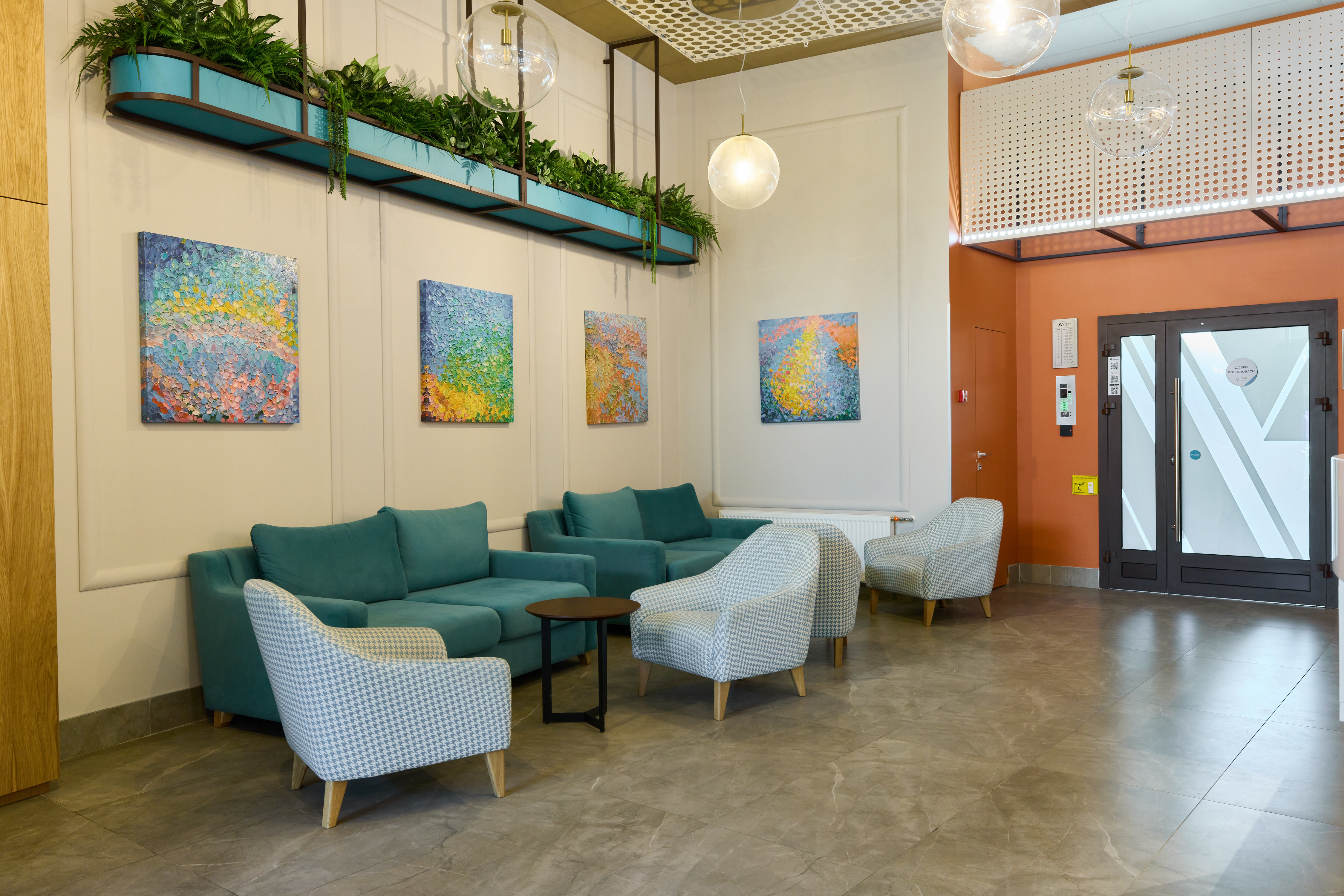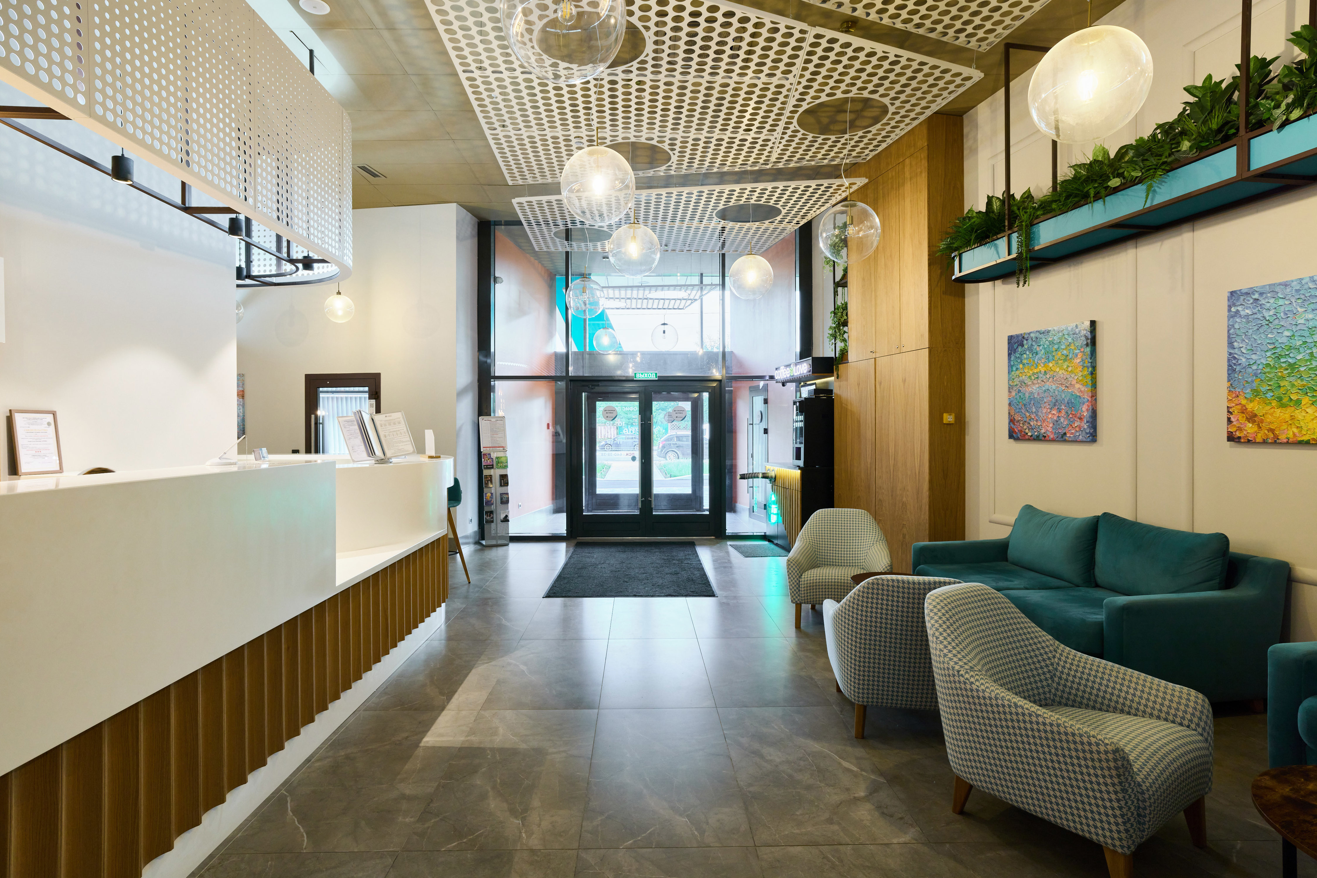 В фойе апарт-отеля есть лаундж-зона, где Вы можете не торопясь выпить кофе и отдохнуть на мягких диванах.