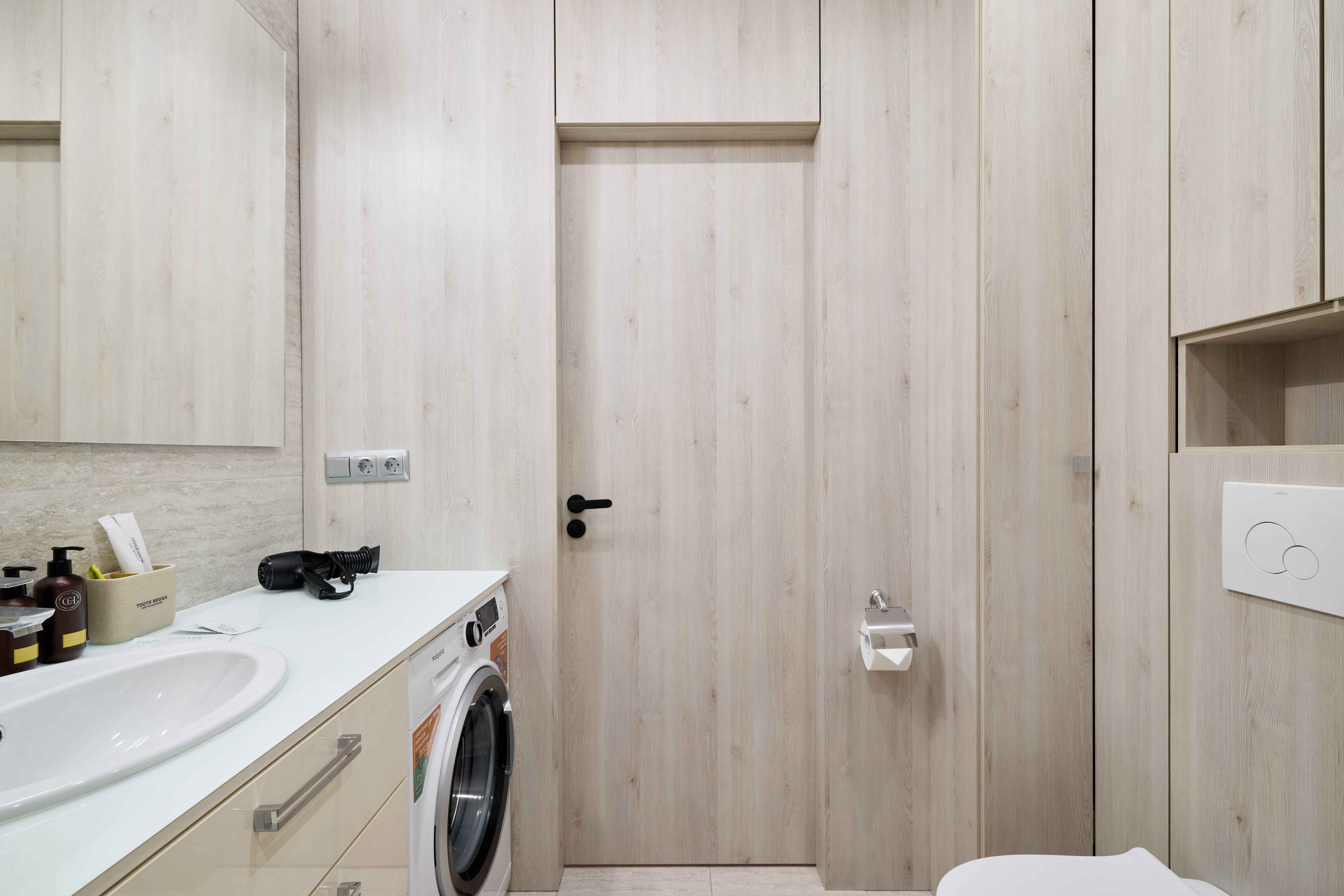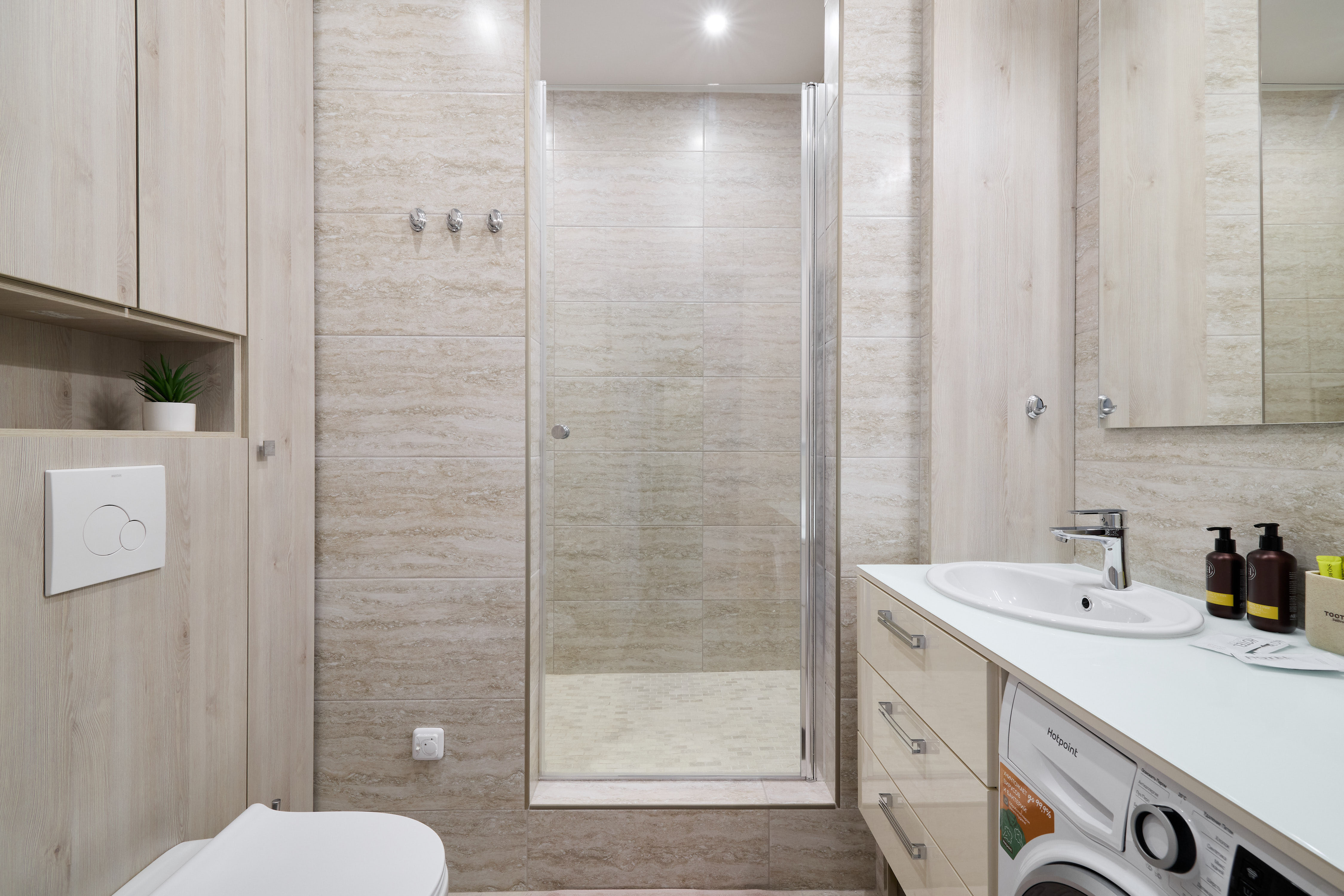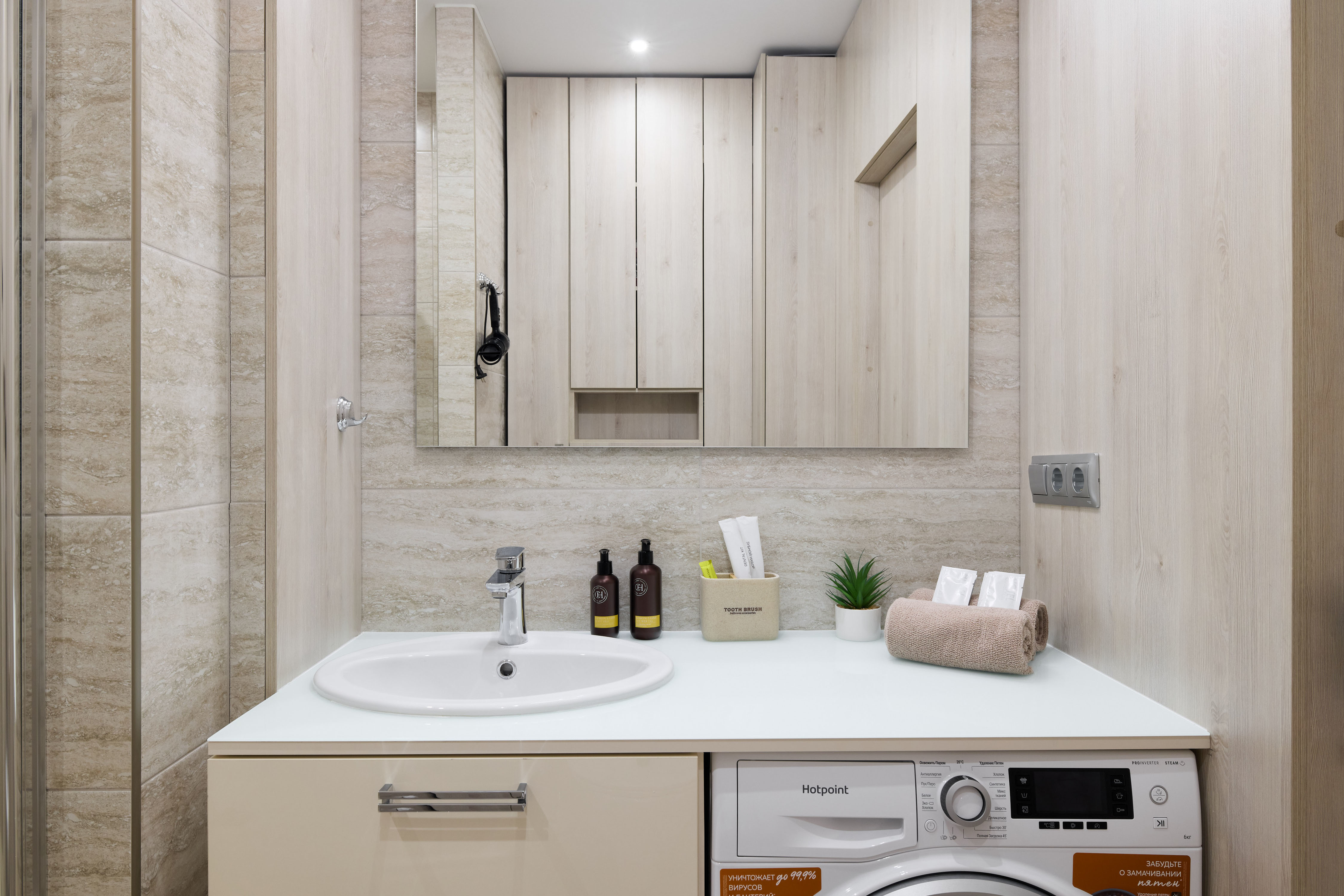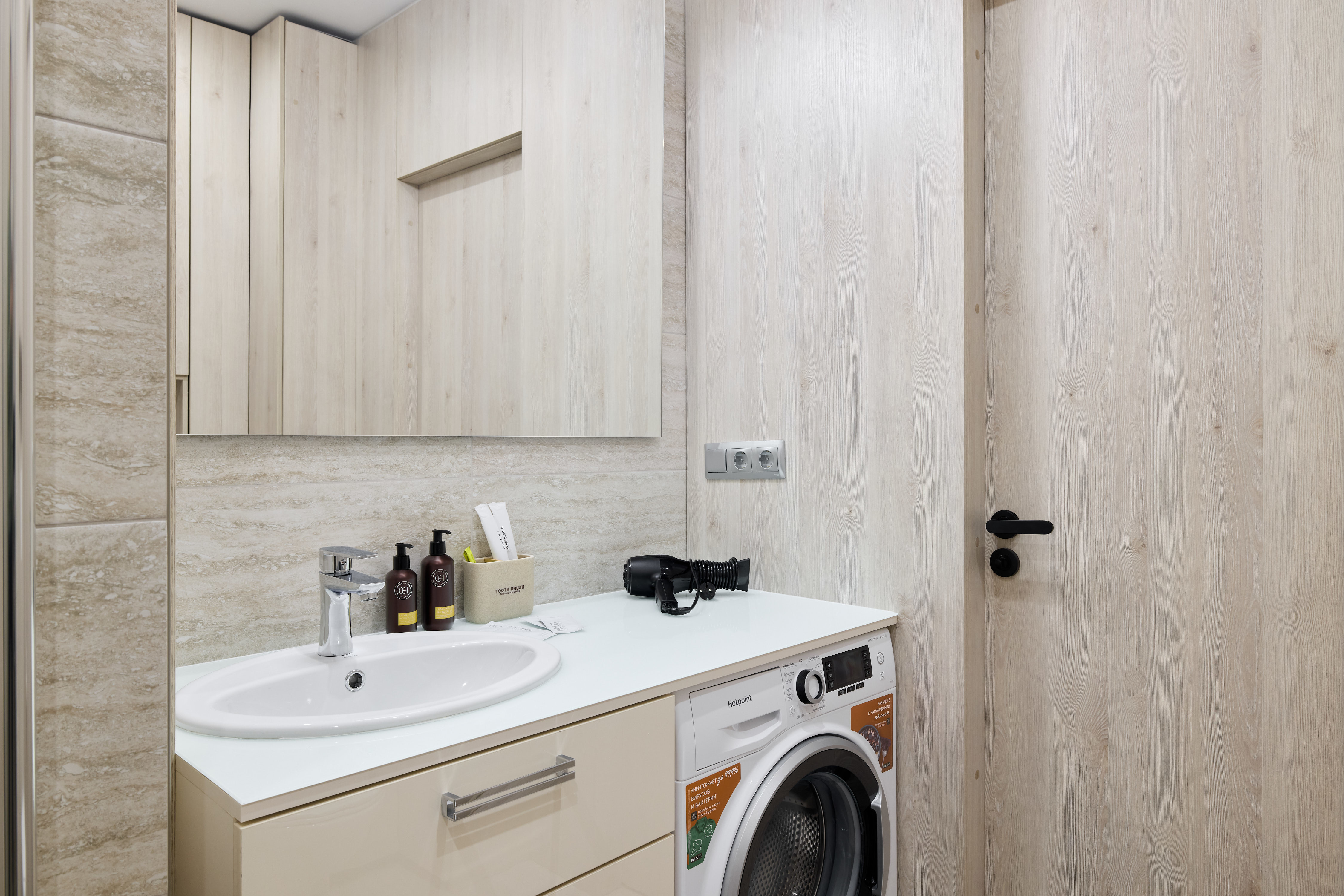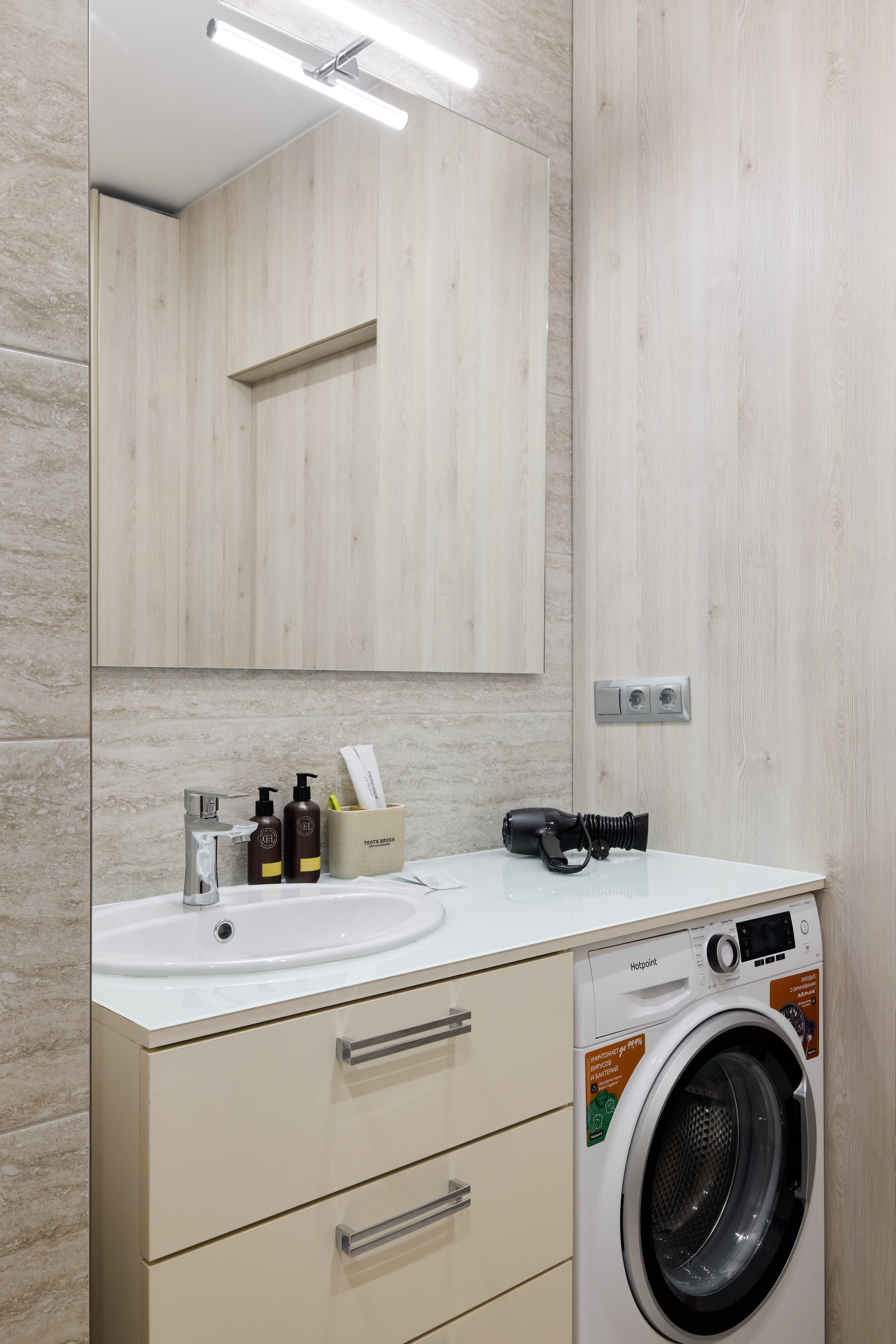 - Ванная комната с душевой зоной и большим зеркалом для наведения красоты, стиральной машиной, феном, одноразовой косметикой, зубными наборами и пушистыми полотенцами.