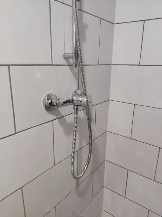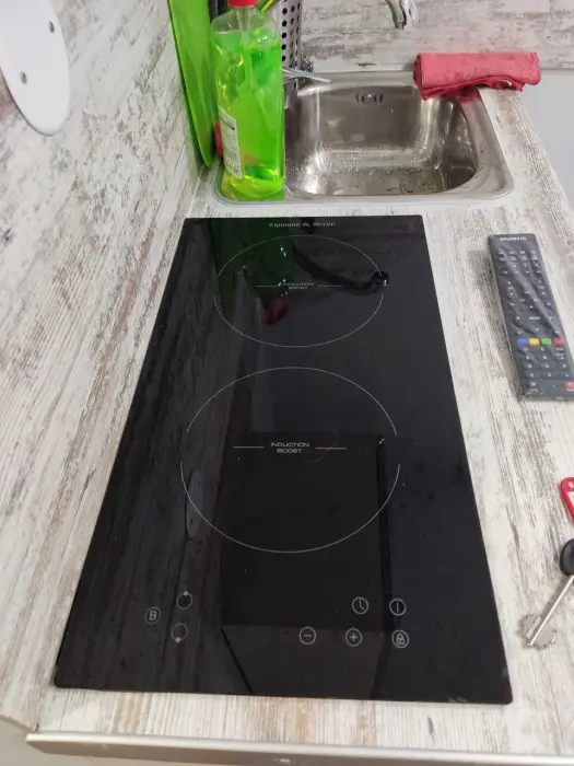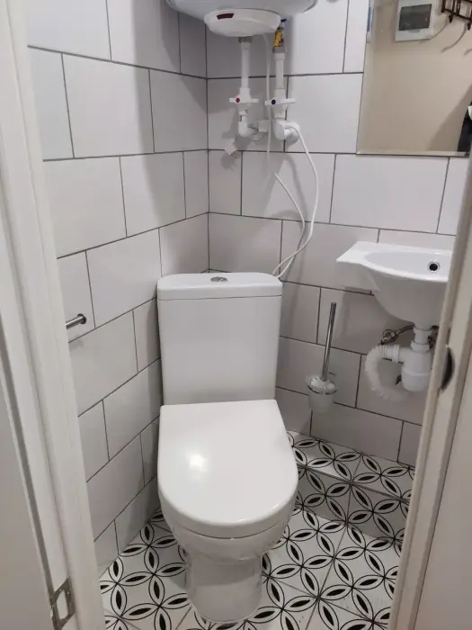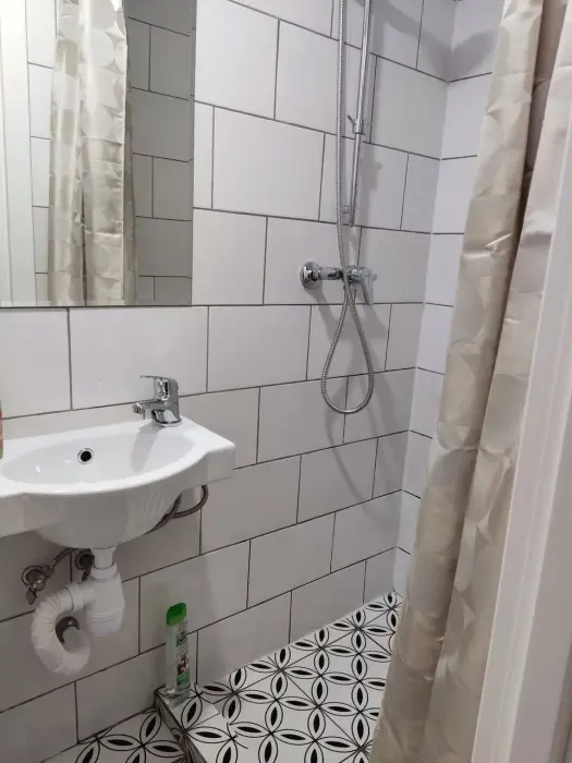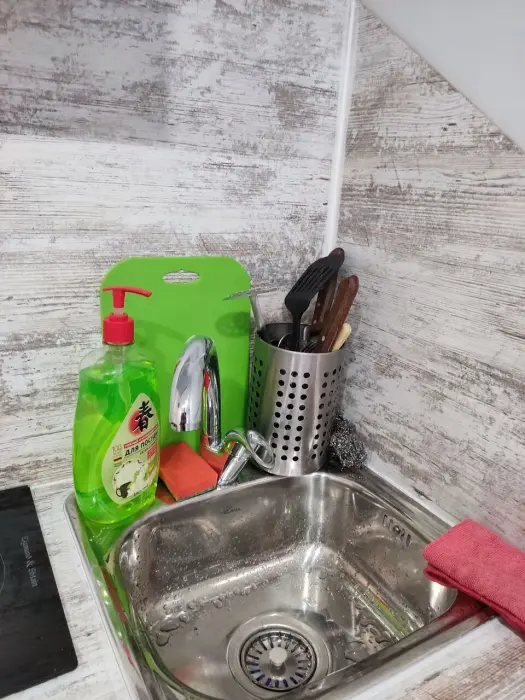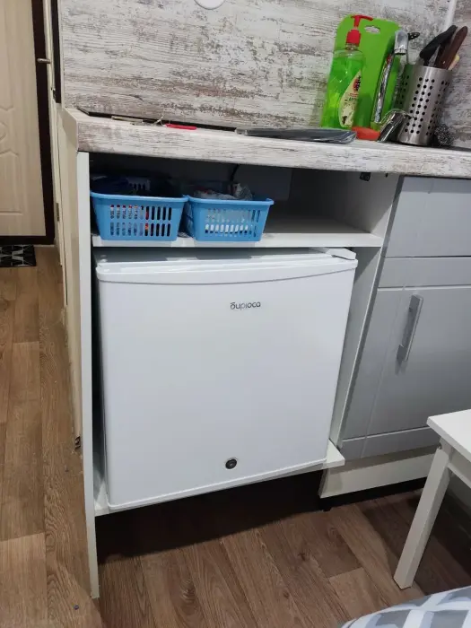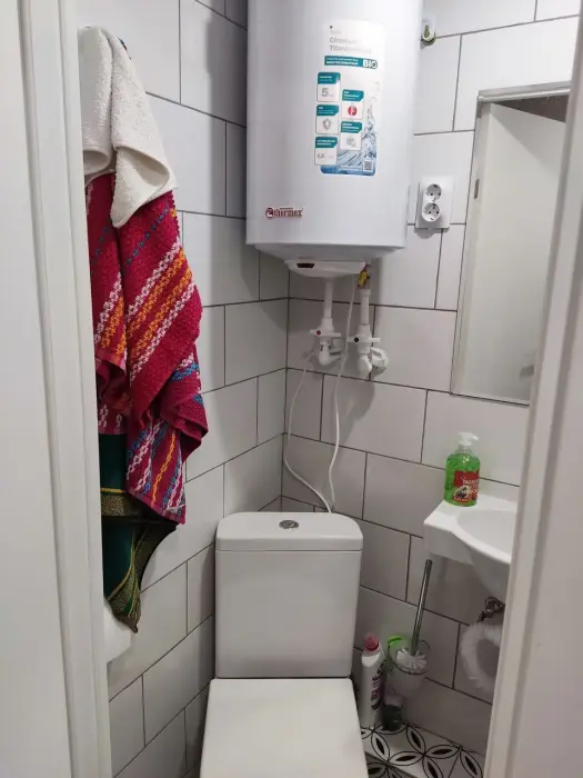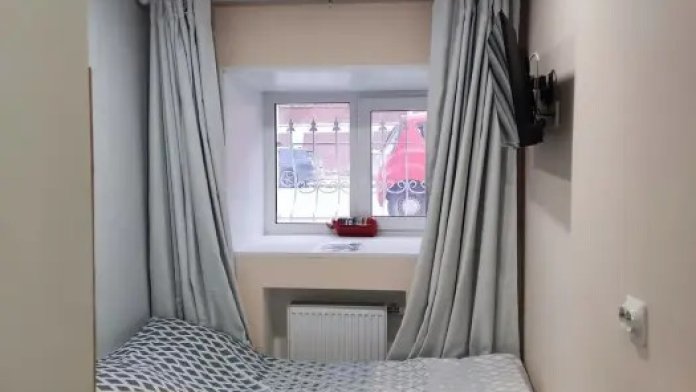 Свой санузел с душевой кабиной, мини-кухня с плиткой, холодильником, электрочайником, набором посуды, двуспальная кровать, табуретки, вешалки, телевизор с многоканальной сетью, Wi-Fi, комплект постельного белья, полотенец, мыло, шампунь, туалетная бумага, всё необходимое для проживания. Но размер всего 10м2, и окно на уровне ног прохожих (цокольный этаж).