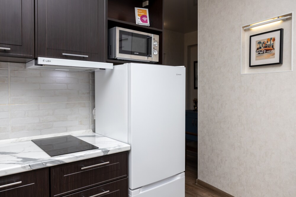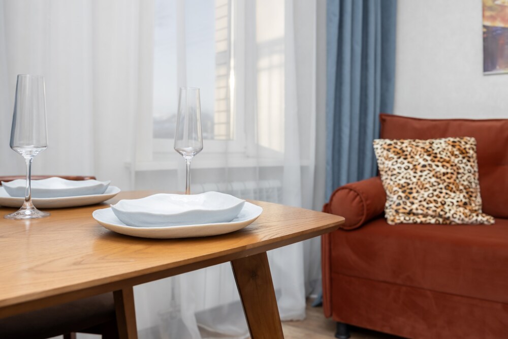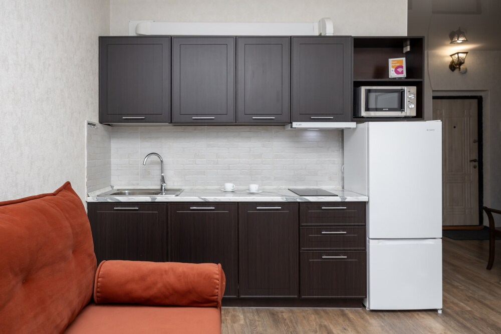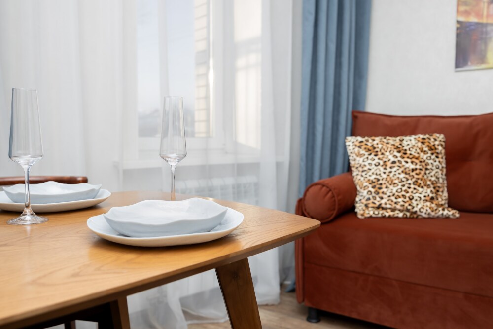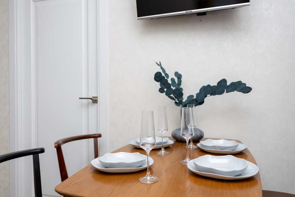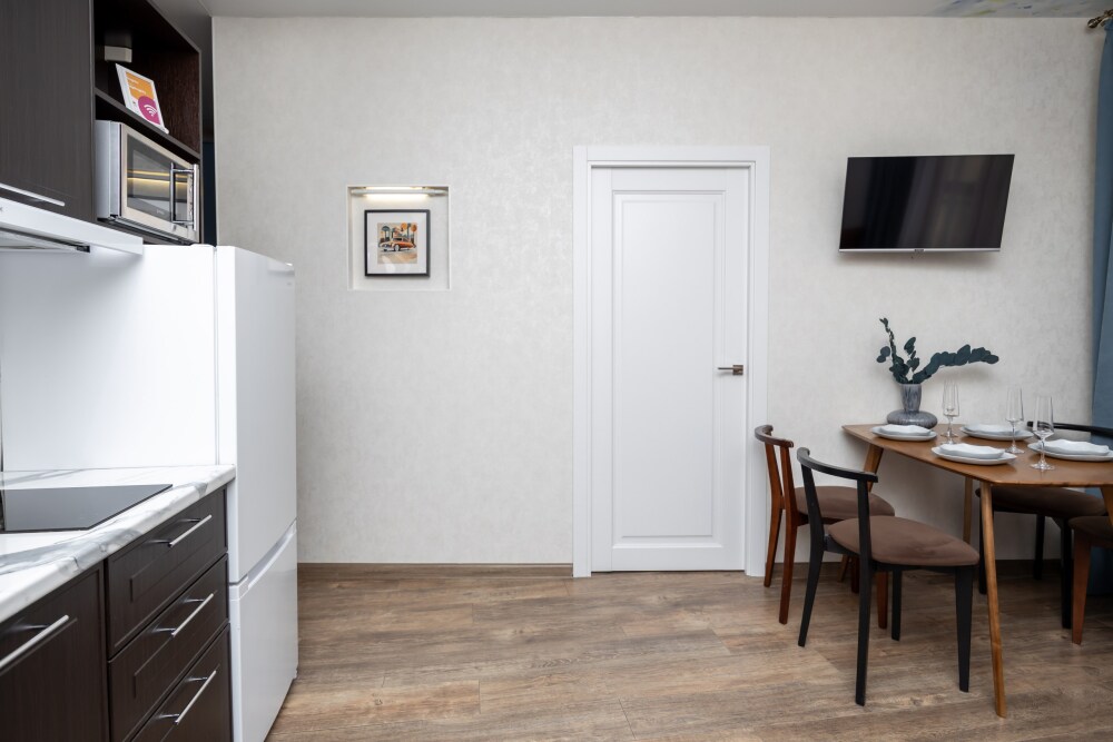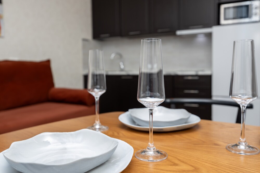 Полностью оборудованные кухни с посудой и столовыми приборами.