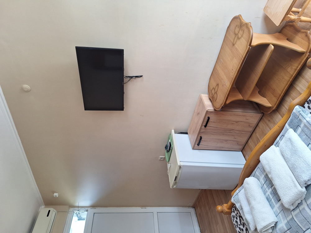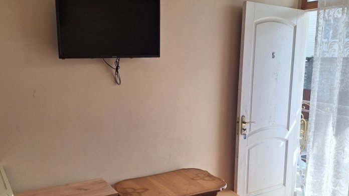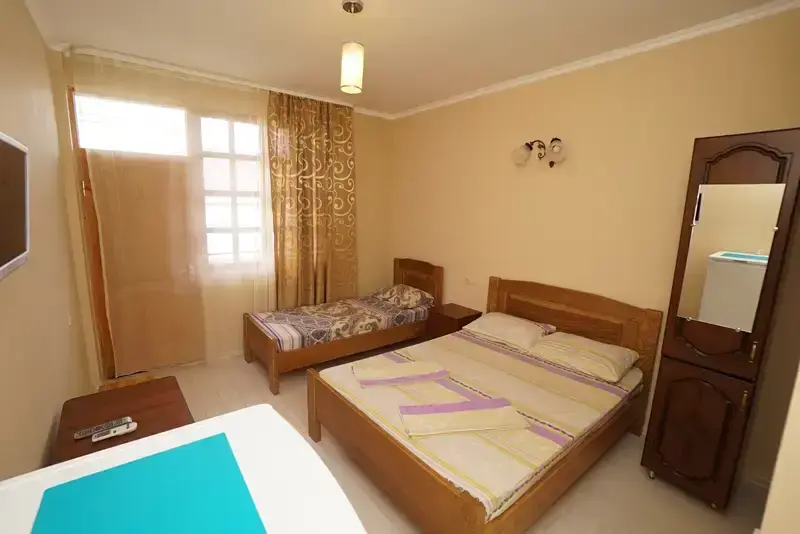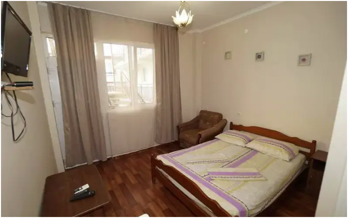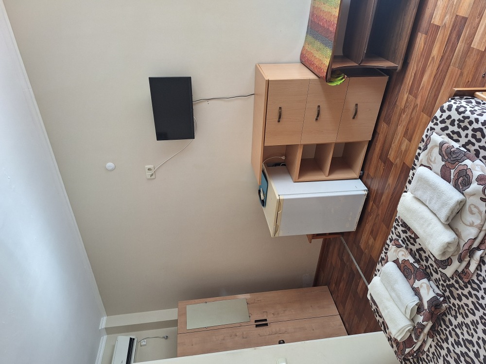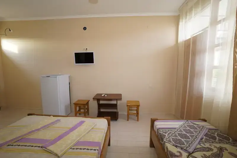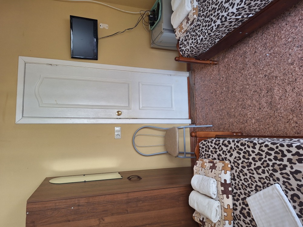 В номере телевизор, вентилятор,,2кровати холодильник, стол, тумбочка.