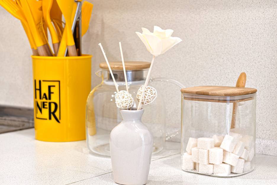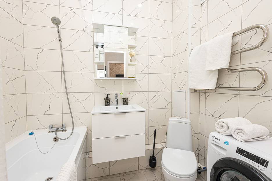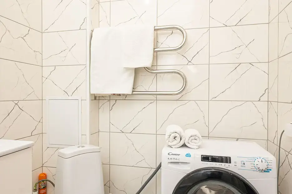 Техника: холодильник, чайник, плита, микроволновка, стиральная машина, утюг, фен. Есть всё для приготовления еды, а также сушилка и гладильная доска.