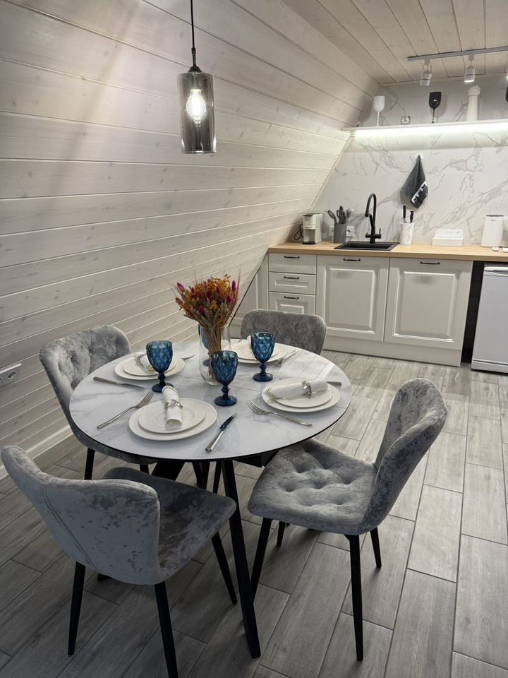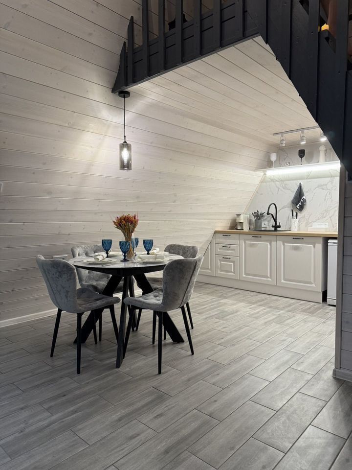 Hа 1-ом этажe рaсположена кухня с современной техникой, включая кондиционер, холодильник, микроволновую печь, индукционную плиту и кофемашину. Обеденная зона оснащена круглым столом и стильными стульями. Гостиная совмещена с кухней, что обеспечивает свободное пространство и удобство передвижения.