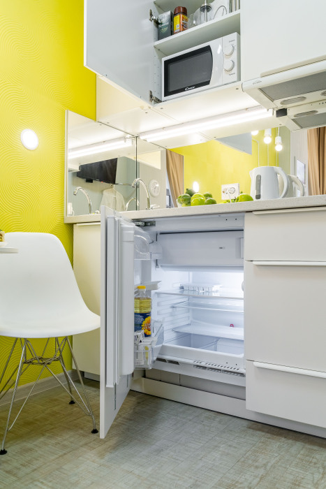 - полностью оборудованный кухонный уголок со всей посудой, электроплита, микроволновка;