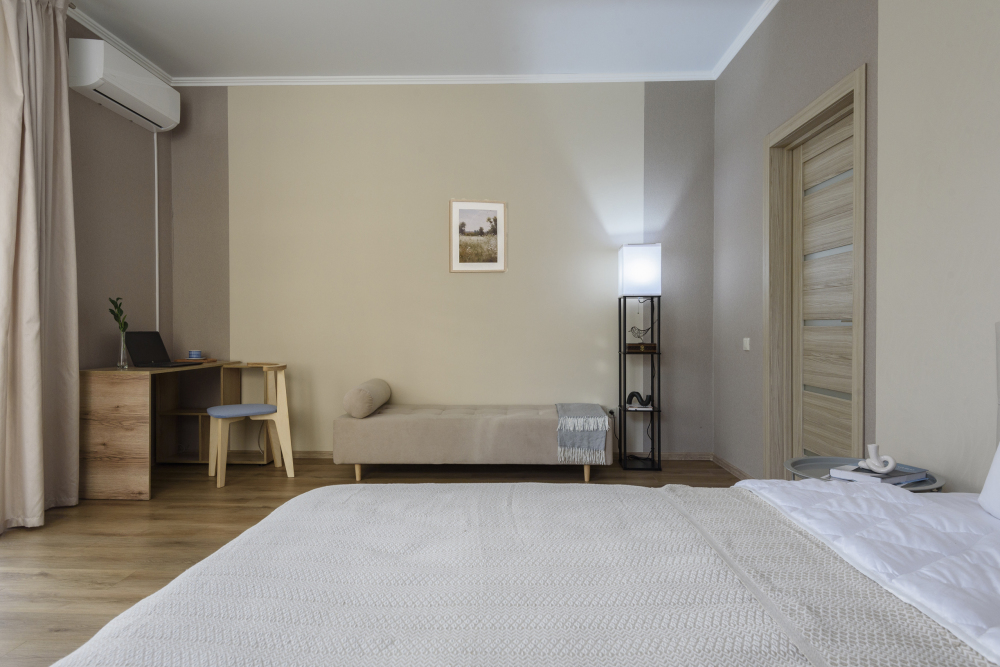 Удобную двуспальную кровать с ортопедическим матрасом, раскладной диван для двух дополнительных мест и одноместный диван.