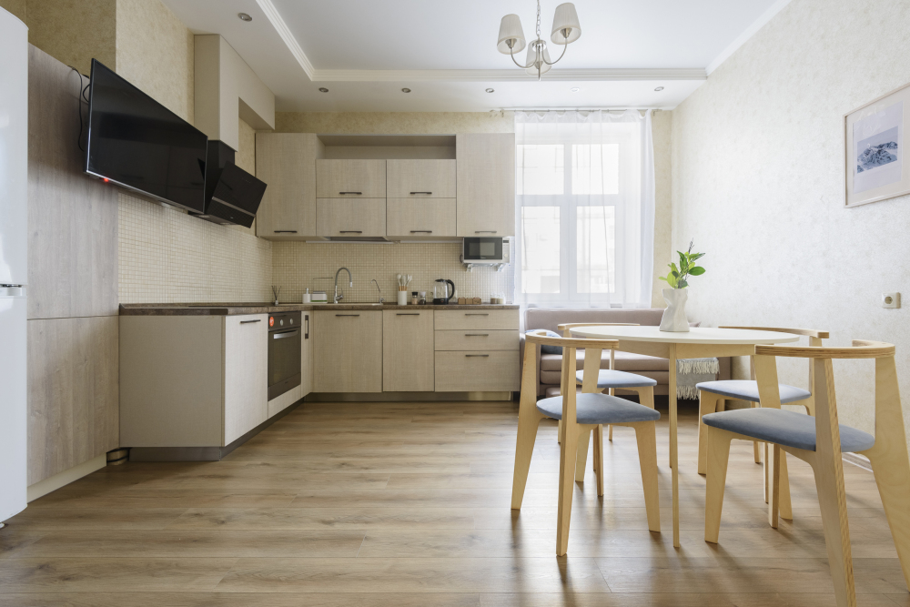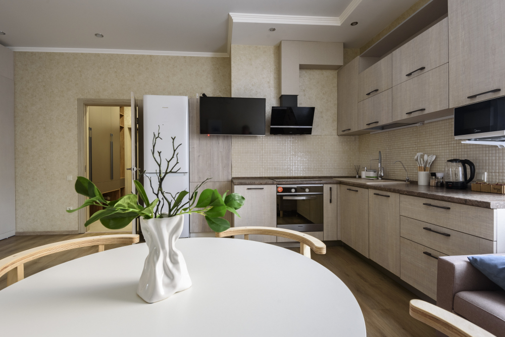 Полностью оборудованную кухню: чайник, плита, духовой шкаф, холодильник , микроволновая печь и всё необходимое для готовки.