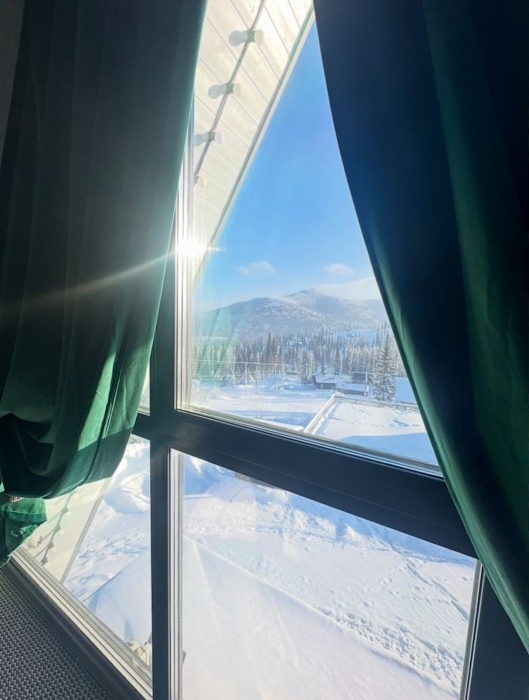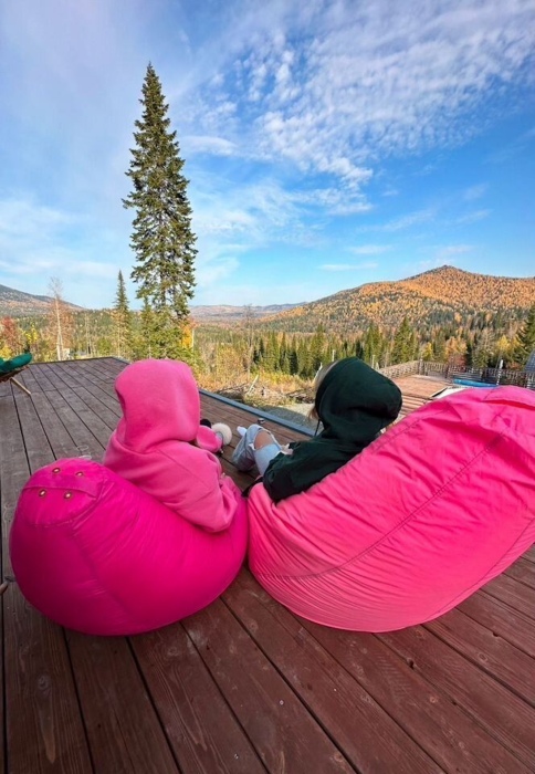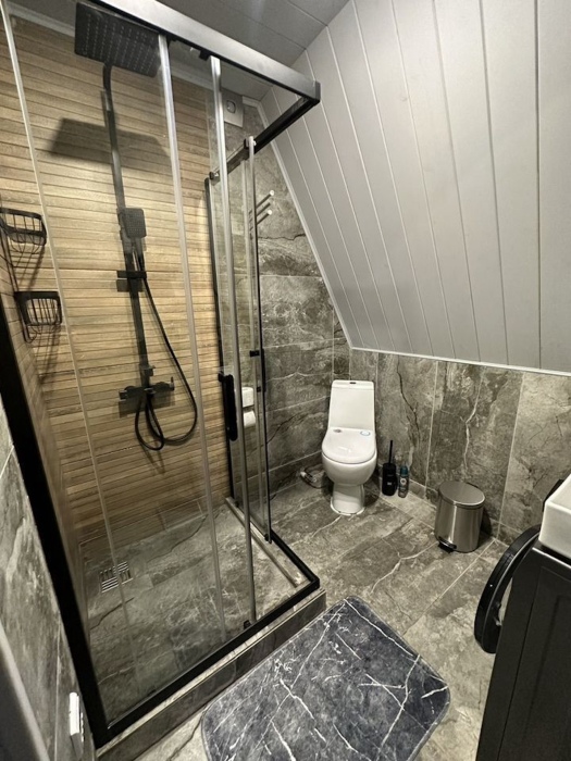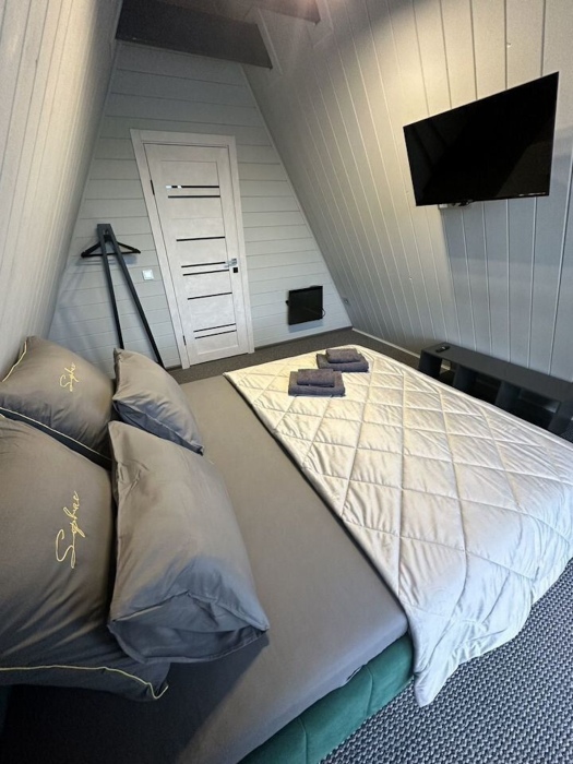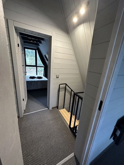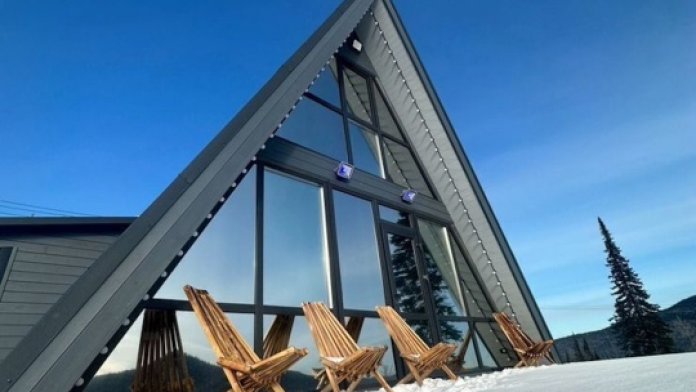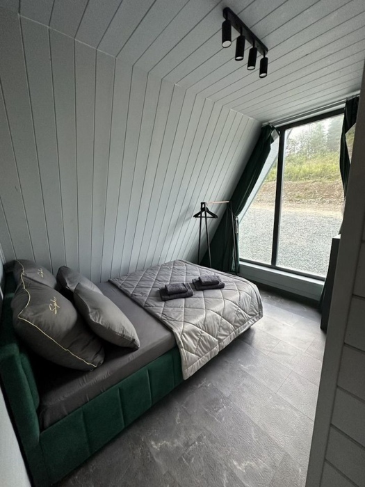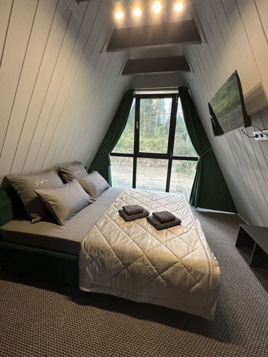 Дом в cтиле a-Фрeйм , c пaнopaмными oкнaми на прекрaснейший вид. Расположен в живописном месте, находится на возвышенности, раскрывающимся видом на красивую природу и горы.